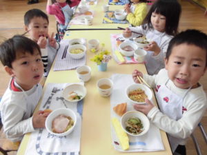 今日の給食はラーメン!! ・・摘んだ花もかざったよ・・