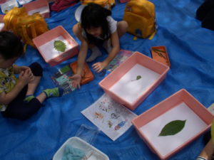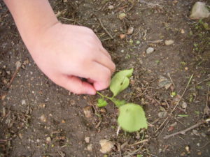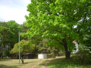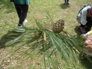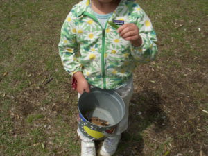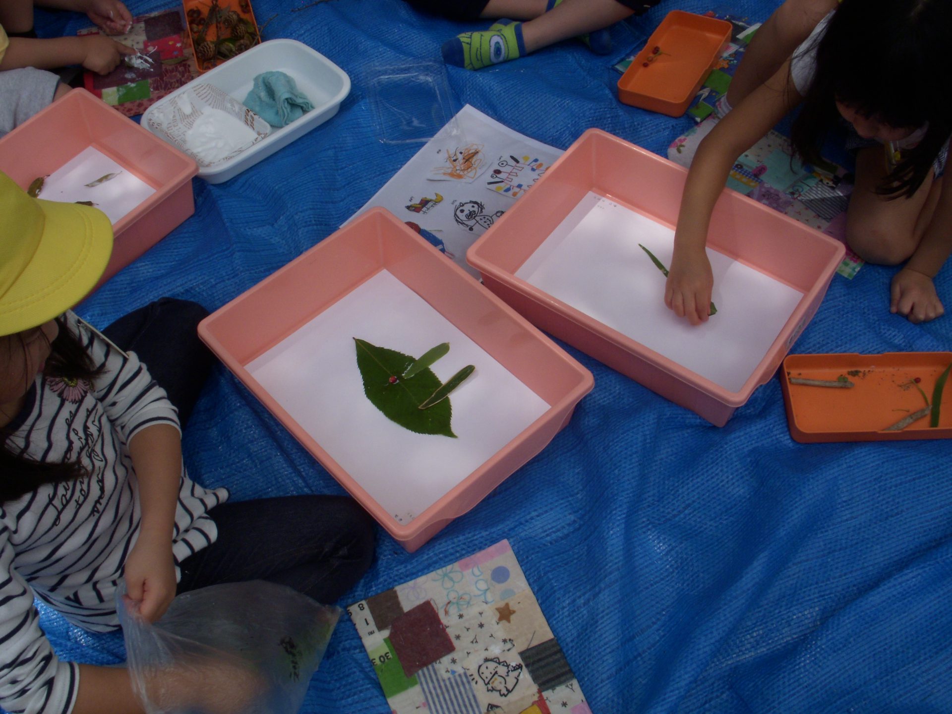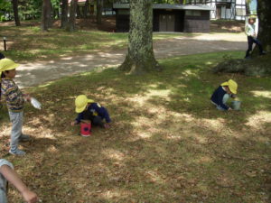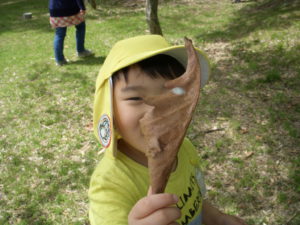 子ども達が大好きな「へんてこもり」のお話、仲良し4人組が園の裏にある「へんてこ森」へ遊びに行きました。空想の生き物の名前を言うと本当にへんてこ動物が表れ、へんな事が起こります。それは、いつも1本のかしわの木の横を通ると起こります。子ども達は、物語の世界に親しみ、いつも遊んでいる森にかしわの木がある事に気が付きました。かしわの木を通るとへんてこ森へ行ける、まるぼやぼさこうに会えるイメージを共有しています。さあ、今日もかしわの木を通ってへんてこ動物に会いに行きます。