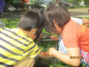 「指でちょんてすると逃げるよ!」「かわいそうだよ!」「じゃあちょっとだけ…」と相談しながら観察していました。