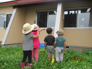 お昼ご飯を食べていると、ゲゲゲゲ…。ケロケロケロ…。低い声が聞こえてきました。「あれ!何か聞こえる!」「わかった!お母さんカエルだ!」実は先日いちごぐみで飼っていたカエルの赤ちゃんが弱ってしまい、ご飯を食べなくなってしまいました。そこで、どうしようと問いかけたところ、「お母さんの所に行けば元気になる!」と言う意見が出て、他の皆も「そうしよう!」と賛成し意見がまとまり、園舎裏に逃がしたのです。