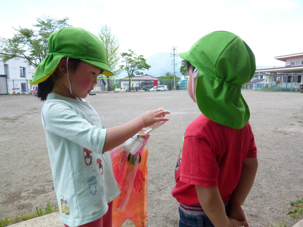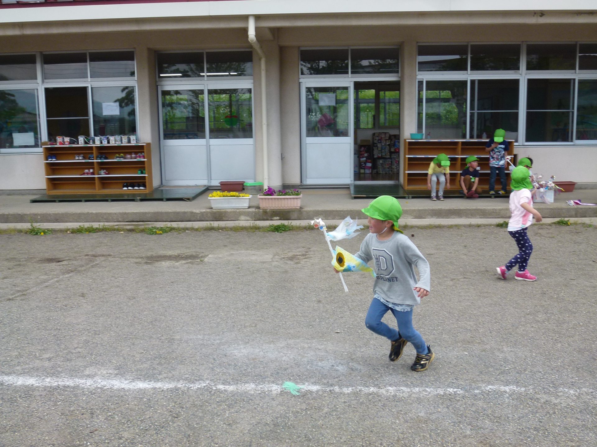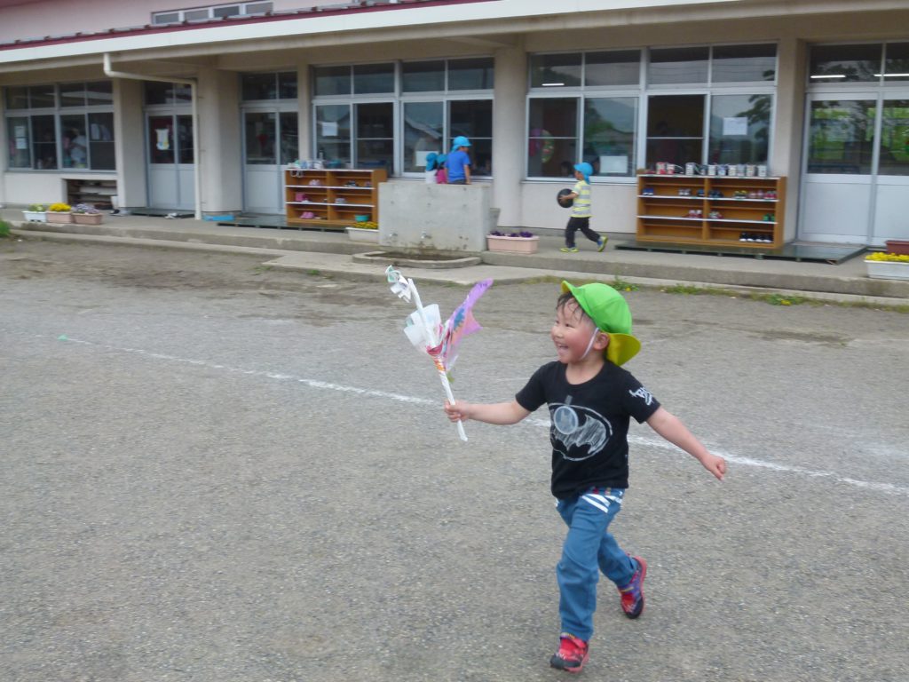 朝の自由遊びで風車を作り、早速回るか外で試していました。