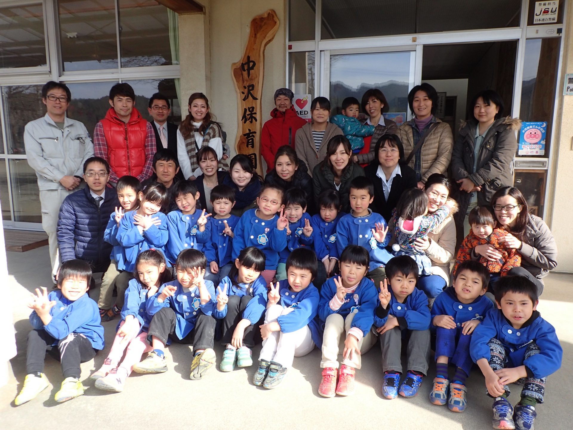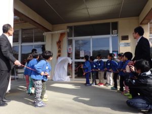 平成29年度卒園児の保護者一同様より卒園記念として園名看板をいただきました。木の板は、1昨年伐採した中沢支所・公民館の前で50周年区民を見守り続けてきた欅の木をいただき、調板ととりつけは地元の大工さんが、文字は駒ケ根市教育長の本多先生に書いていただきました。大勢の方々のご好意とご協力によりすばらしい看板をいただくことができました。以前の看板は昭和58年から35年間、保育園の子供たちを見守ってくれました。新しい看板も園児の活動や成長し育ちゆく姿を温かく見守ってくれることと思います。除幕式という貴重な体験や、感謝の気持ちを込めて、お礼のプレゼントを作ってくれた子ども達に