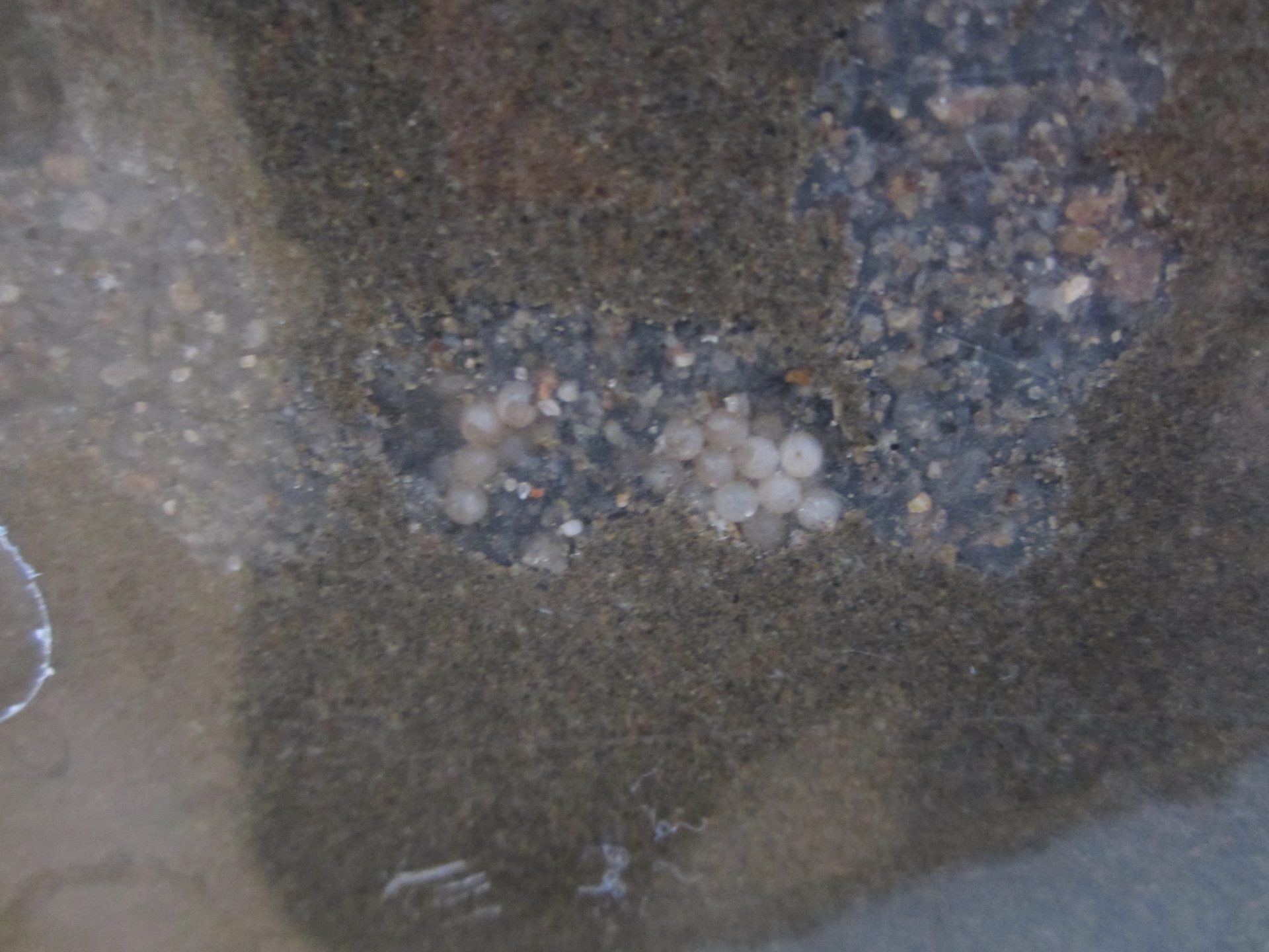以前、保育園の園庭で見つけてから大切に飼っているカタツムリたちが、飼育ケースのとても見やすい位置に卵を産みました。