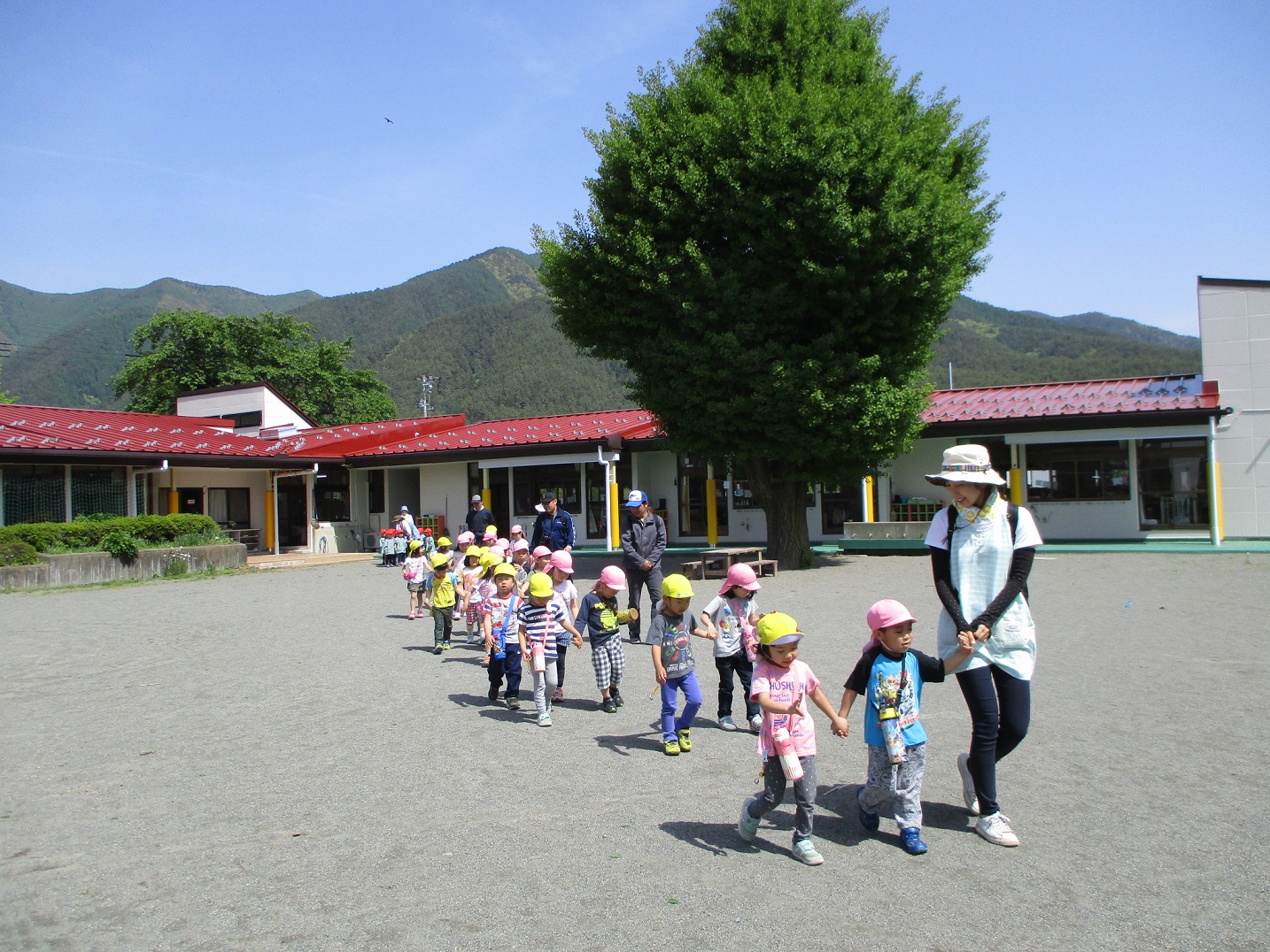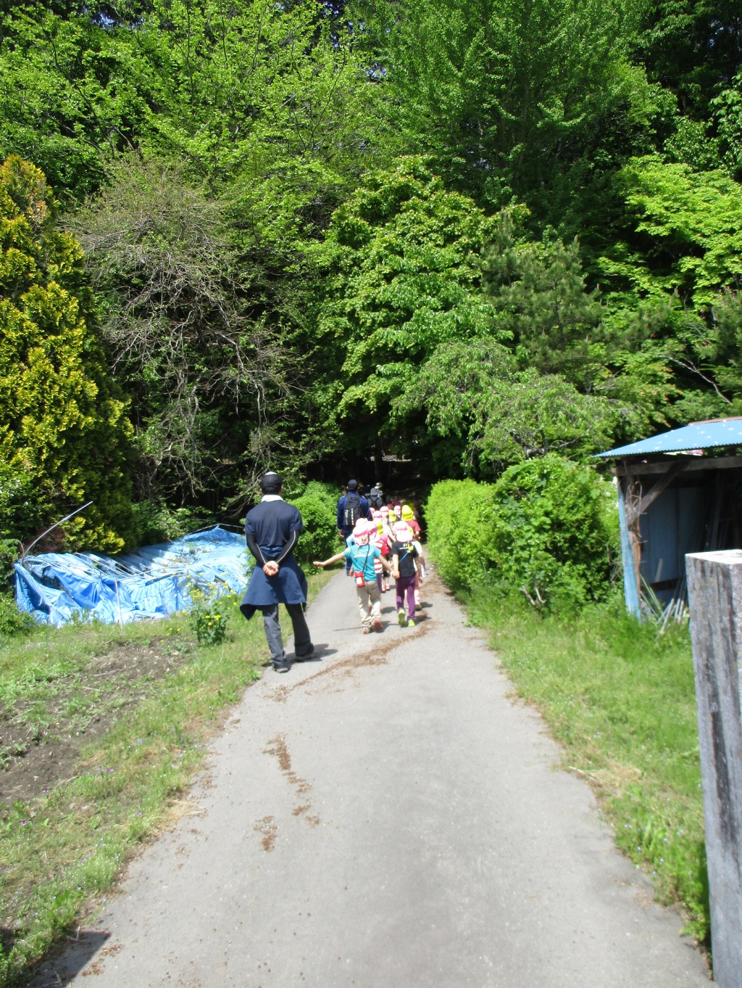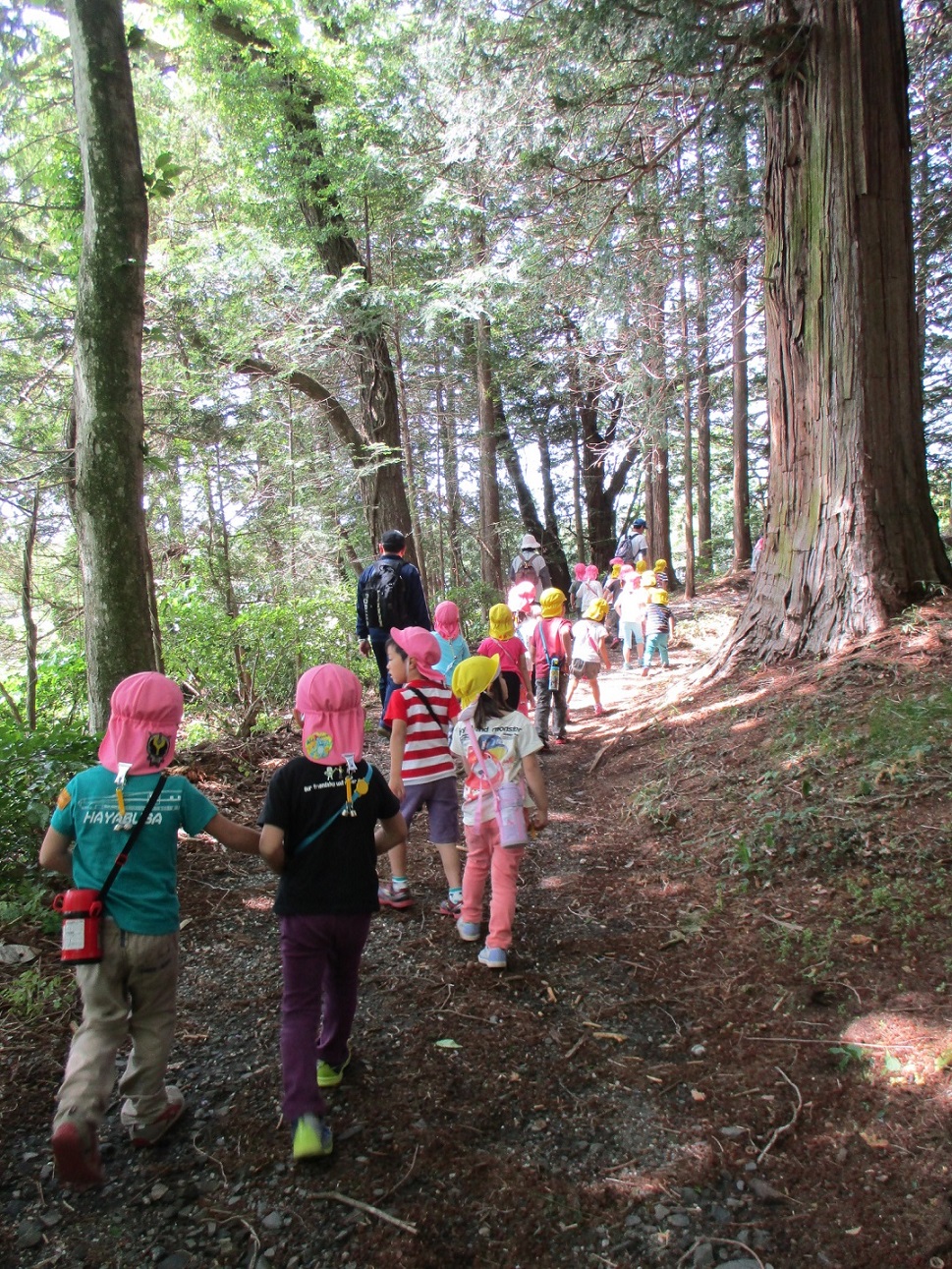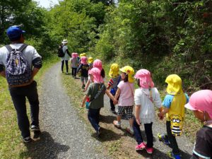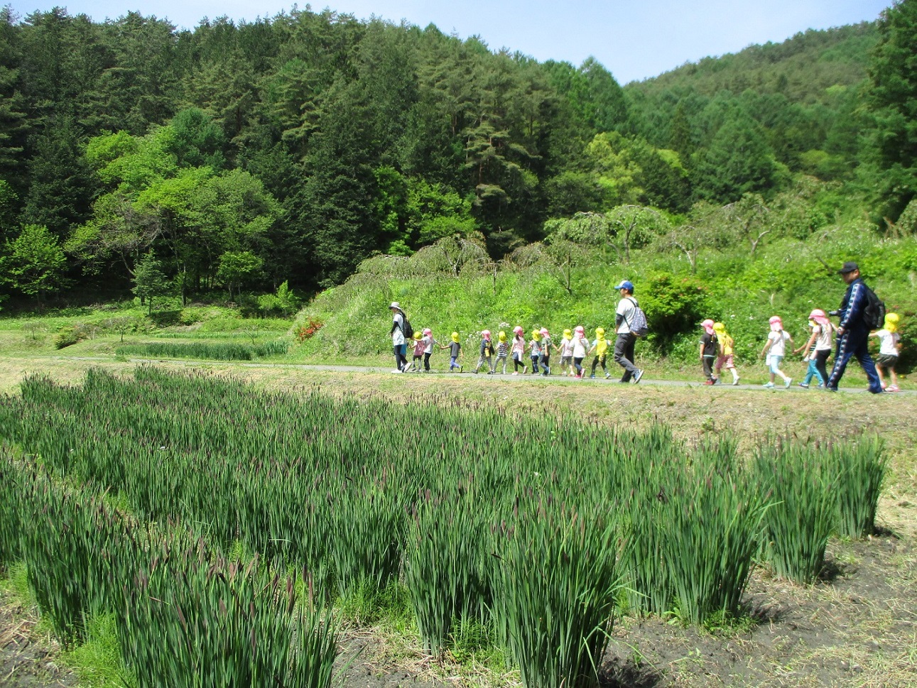 今日は、保育参加のお父さんと一緒に山のアヤメ畑まで散歩に行きました。