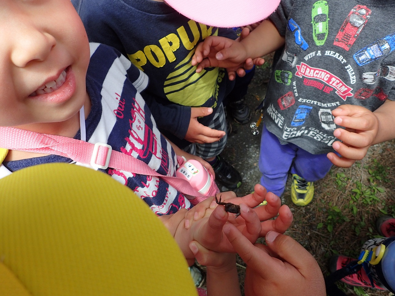 「赤ちゃんの〝かに„をみつけた」と大喜び。友達に見せてから、「かわいそうだから」と川に戻していました。