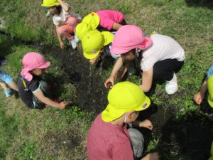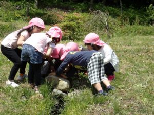 林を通り抜けるとそこには・・・、まだまだ蕾のアヤメの花に残念がる子どもたちでしたが、アヤメ畑の散策や見つけた小川での発見に喜んでいました。