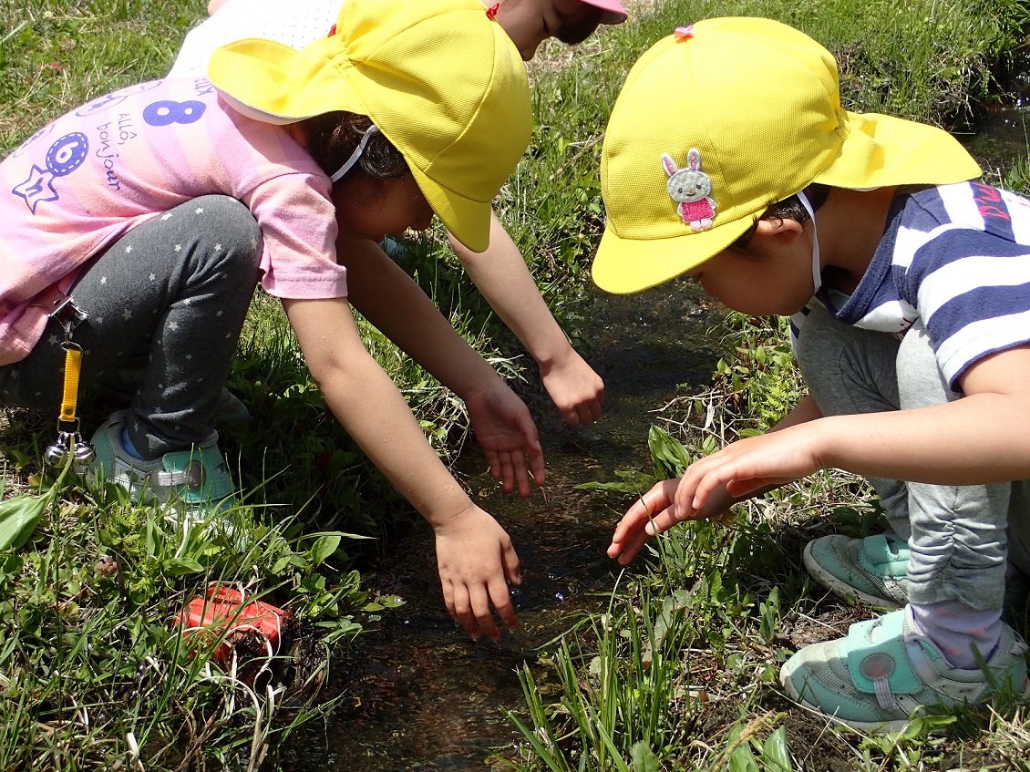 小川では、水の冷たさに歓声をあげながら草を流したり、何かいないかと探しています。