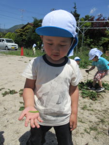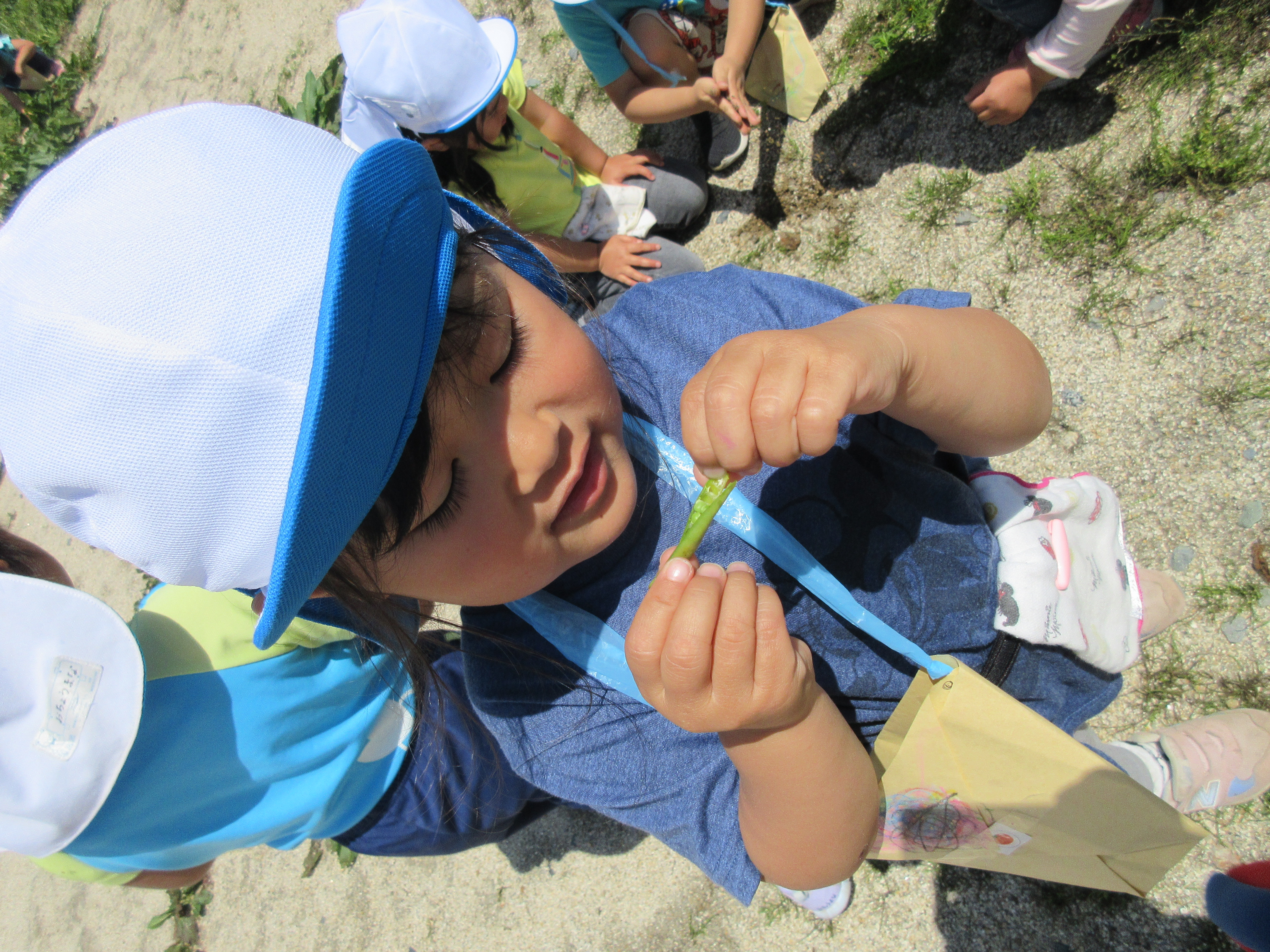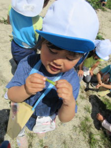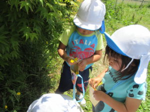 自分達で作ったお散歩バックを持って、わくわく広場へ行き草花遊びを楽しみました。
