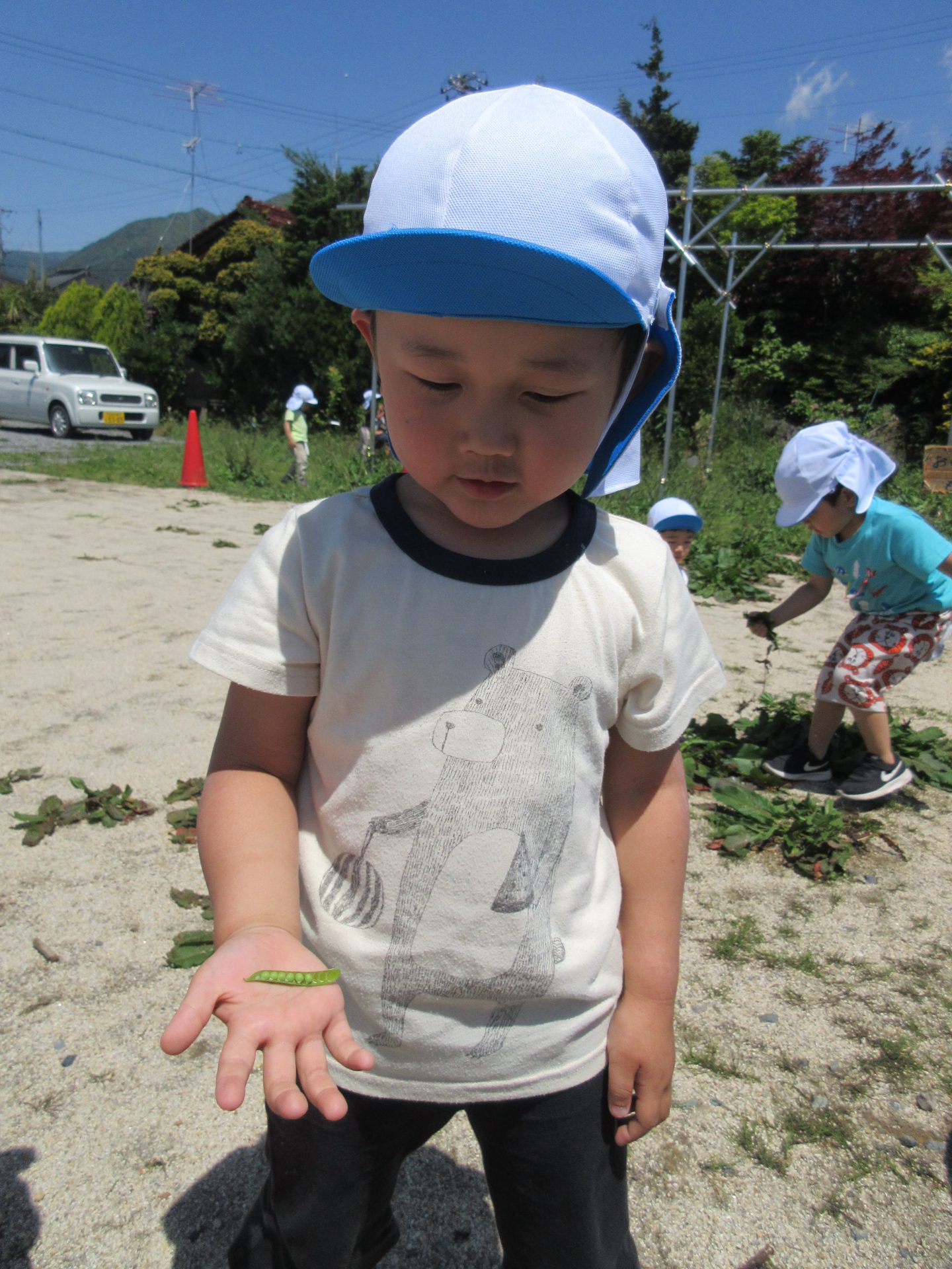 カラスノエンドウを手のひらに乗せ、「この中にお豆が入っているよ!」と得意気に教えてくれましたよ。豆を開き、中の豆を取り出して見せてくれました!