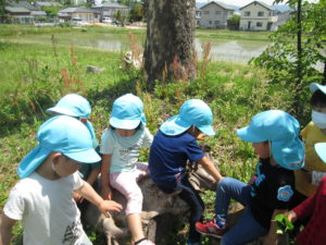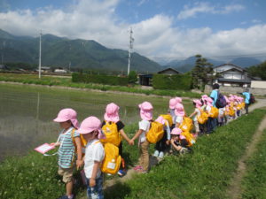 土手を歩いていると「田んぼに山が映っているよ。」と4歳児の子ども達、足を止めて少しの時間美しい景色を眺めます。「山に雪が残っているよ。」と周りの季節の変化にも気がつきます。