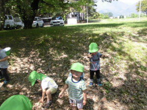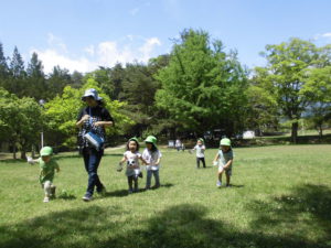 先生と一緒に春を探します。2歳児でも穂高荘は大好きな場所です。広い草原を自由に走り回り自ら遊ぶようにもなりました。