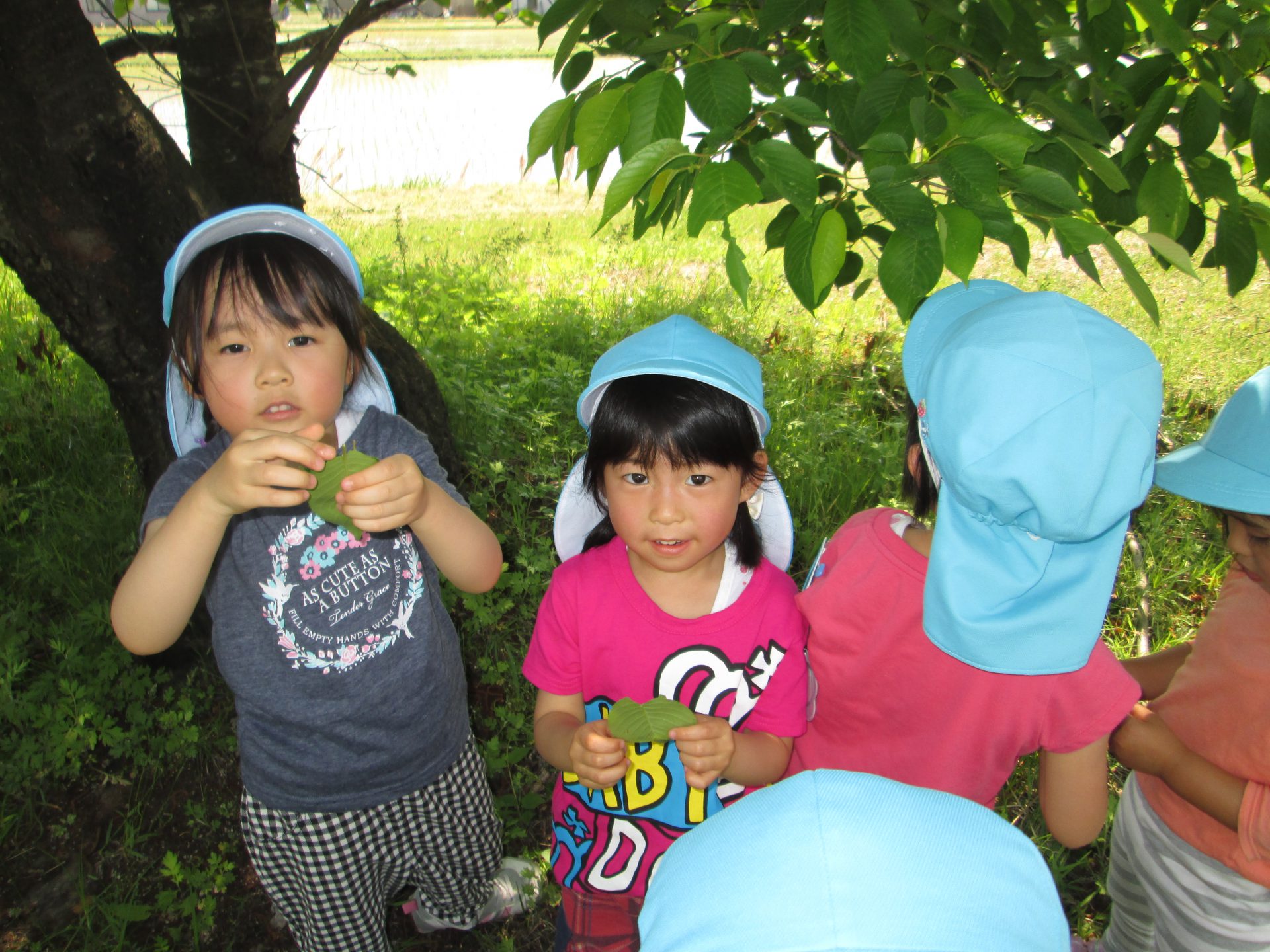 大きなさくらの葉を拾い先生に「大きいね。」と見せている3歳の女の子達。様々な自然物に触れる事ができます。
