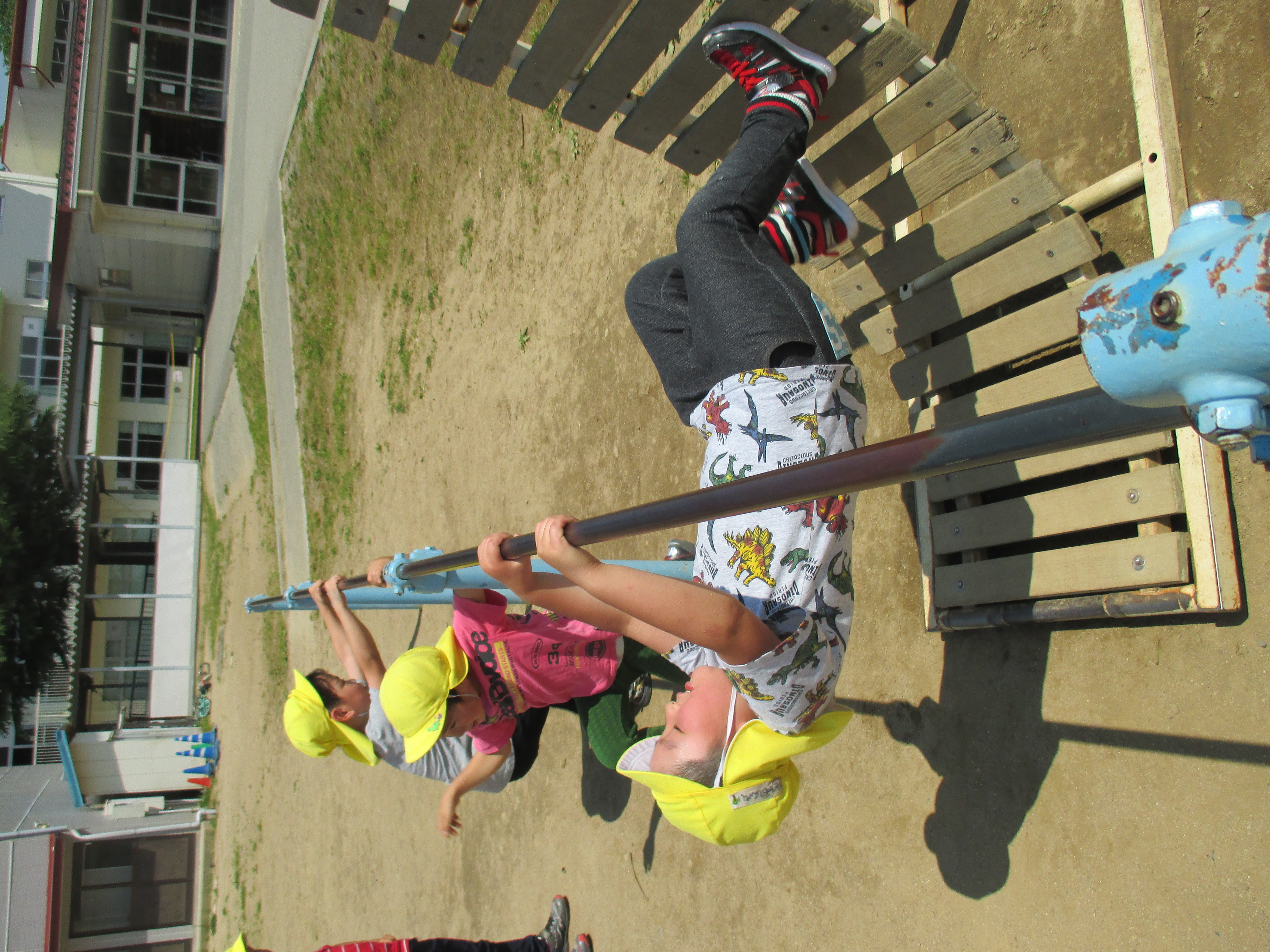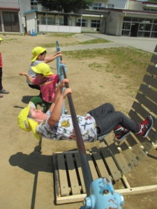 鉄棒が好きな年長さん、早速小学校の鉄棒に挑戦です。