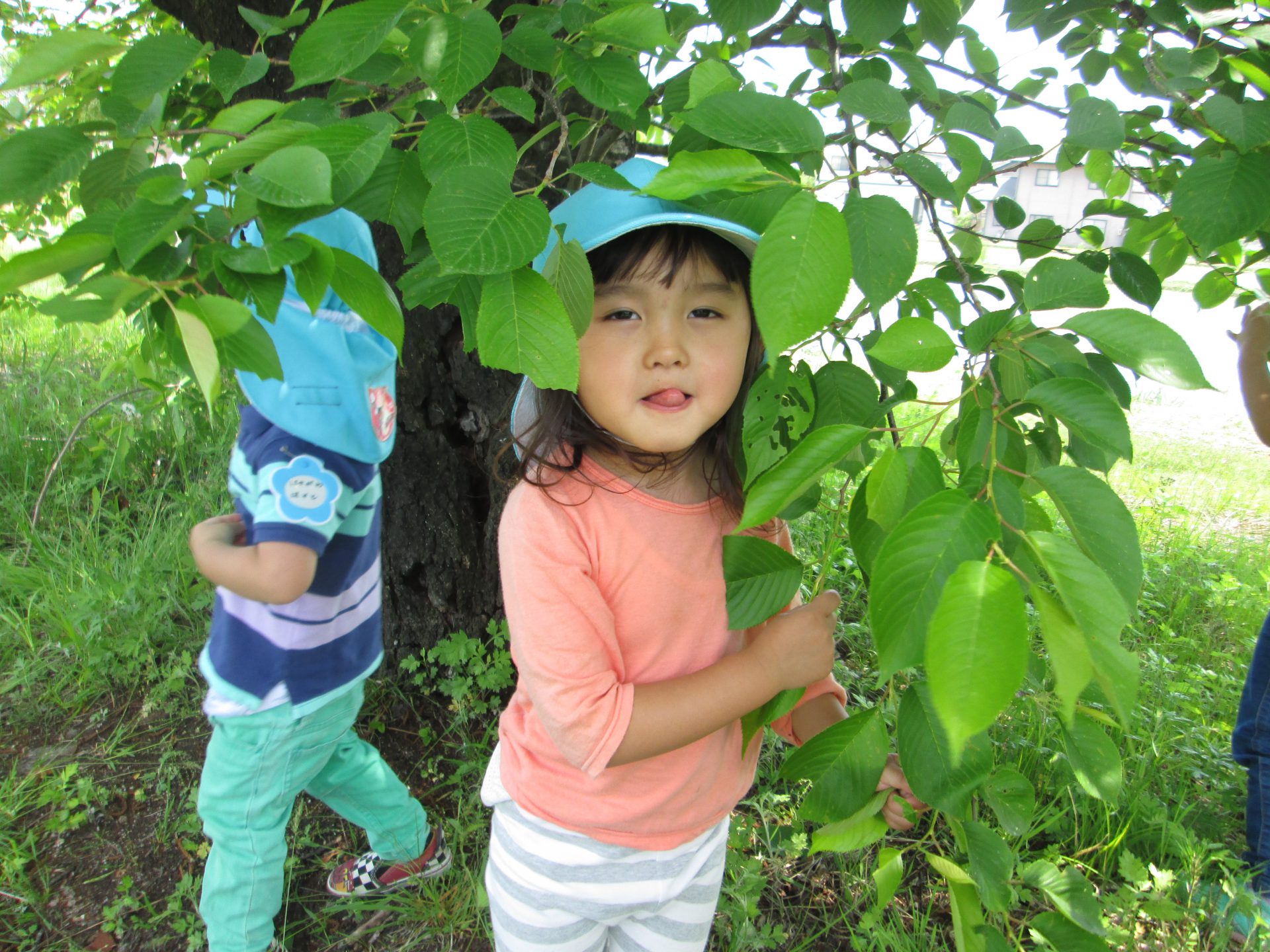 虫食いの葉を見て「虫さんいたのかな。」と話しかくれんぼをしています。
