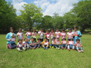 4歳児は、地域の新屋公民館で道祖神を見たり、牧場でポニーと遊び、畑で仕事をされていたおじいさんとの会話を楽しみ、最終目的地の穂高荘に到着!!途中水鏡に映る有明山を見たり、地域の人と関わることができたりしました。手作り地図を提げて「今、ここだよ。」と話しながら歩いていました。目的を理解し地域を知る良い経験となりました。