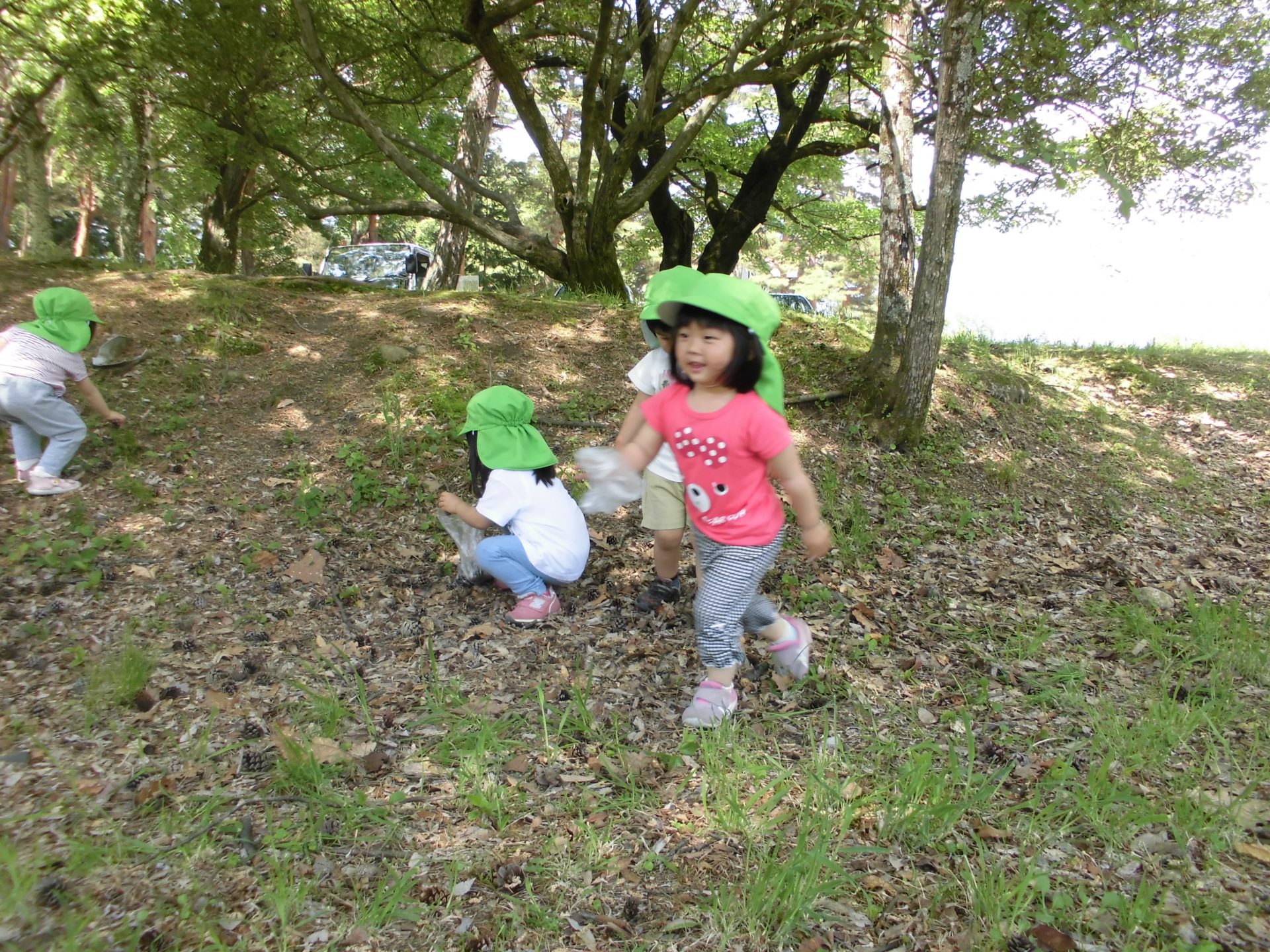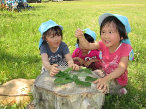 集めたさくらの葉で「ままごと」が始まりました。年長さんや年中さんがクッキング保育でかしわ餅作りをする様子を見学した経験から「かしわ餅作ろう。」と始まりました。日々の生活や遊びの経験が生きていると感じた瞬間でした。自然との関わりを通して遊ぶことへの意欲が増してきている事を実感します。四季折々の景色の変化を感じることのできる子ども達です。
