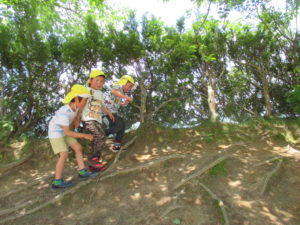 忍者ごっこをしている年長さん、修行の旅をしています。「この道を落ちないように進もう。」