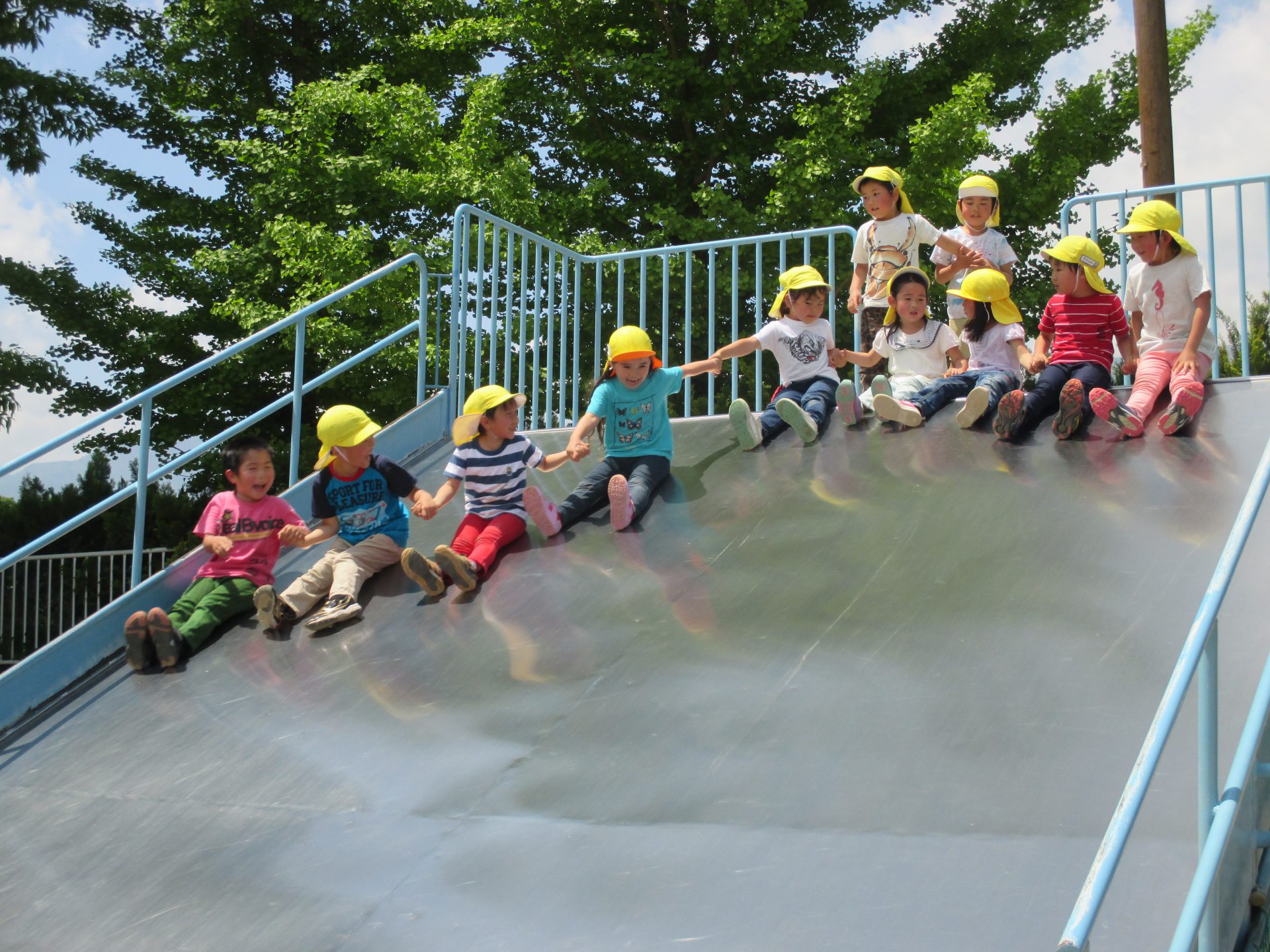 「みんなで一緒に滑ろう!」と手を繋いでスタートです。