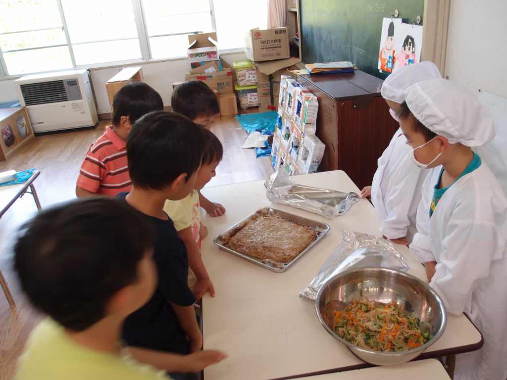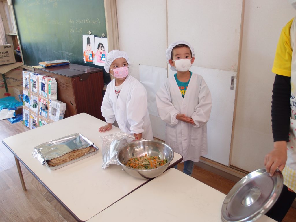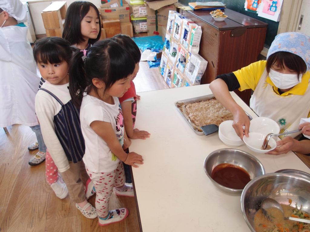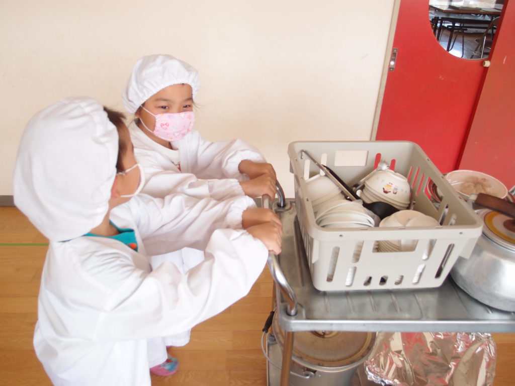 焼きたてほかほかの頃、いつもよりもちょっと早めに年長さんのお当番さんが給食をとりにきてくれました。