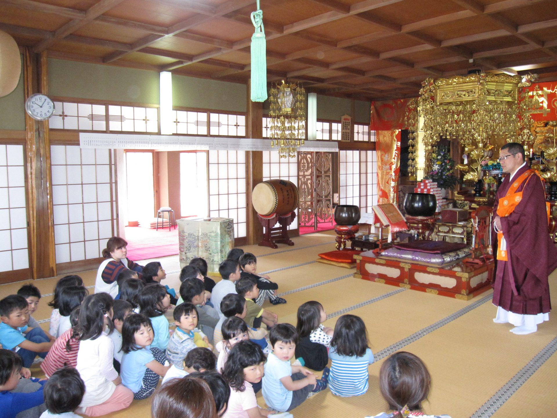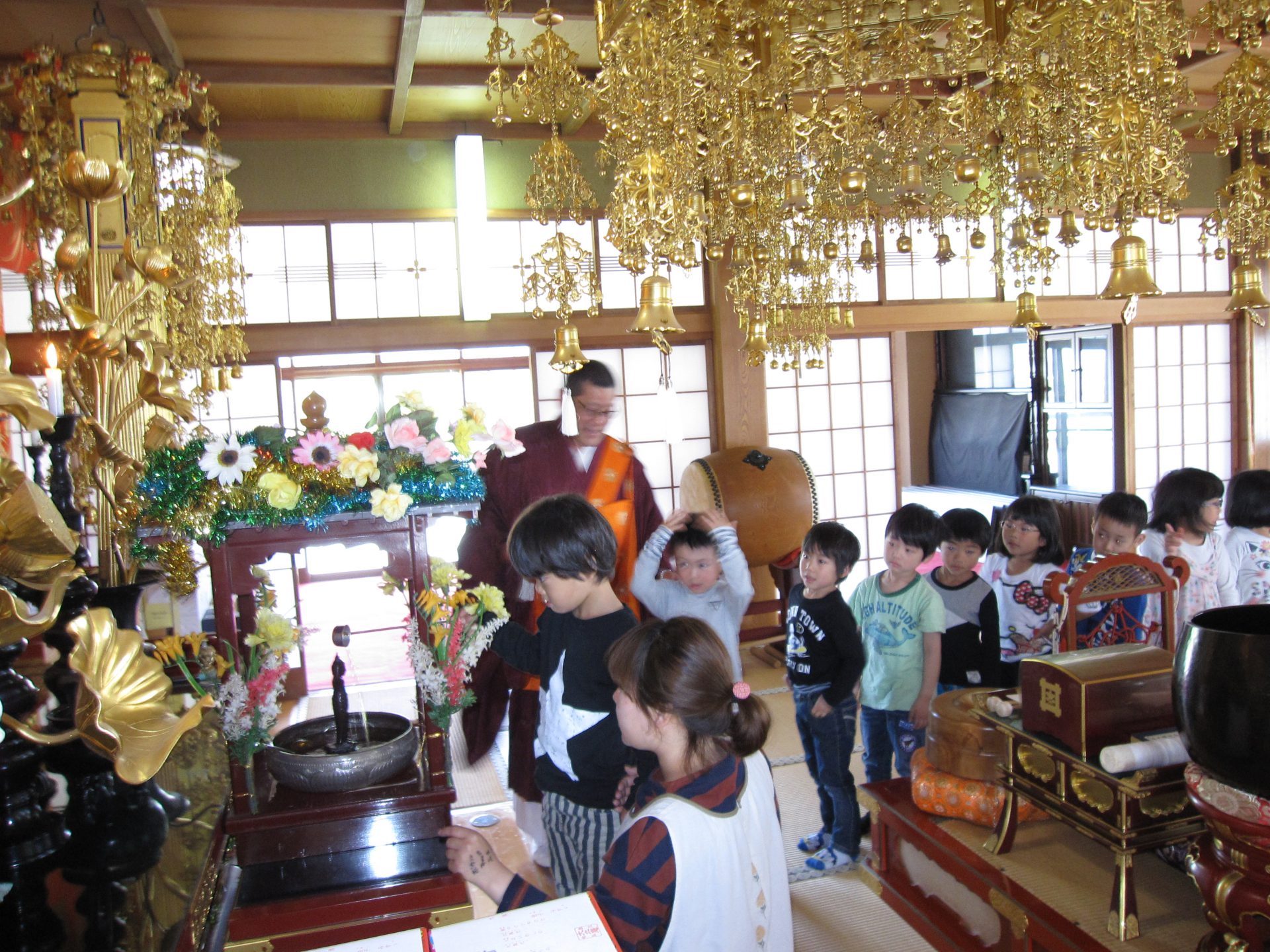 いつもと違う厳かな雰囲気の中お話しを聞いてどんなことを感じてくれたでしょうか。地域の方が保育園の子どもたちを大切にしてくださり招いてくださることに幸せを感じてほしいと思います。一人ひとりを撫でてくれた住職さんの手は優しかったね。