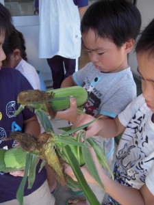 「ここにもとうもろこしがある!」「まだ小さいね。」「こっちのは大きいよ。」