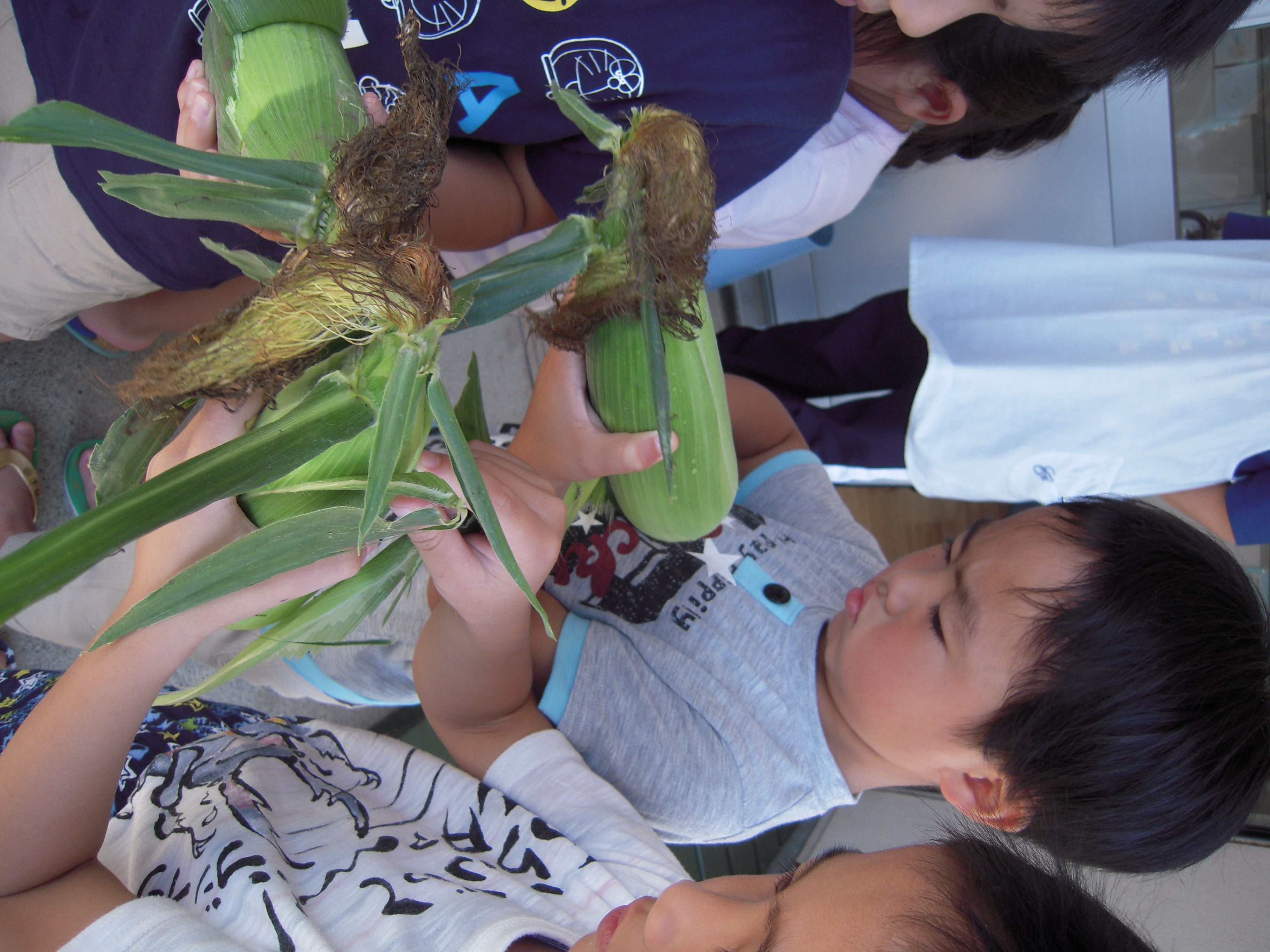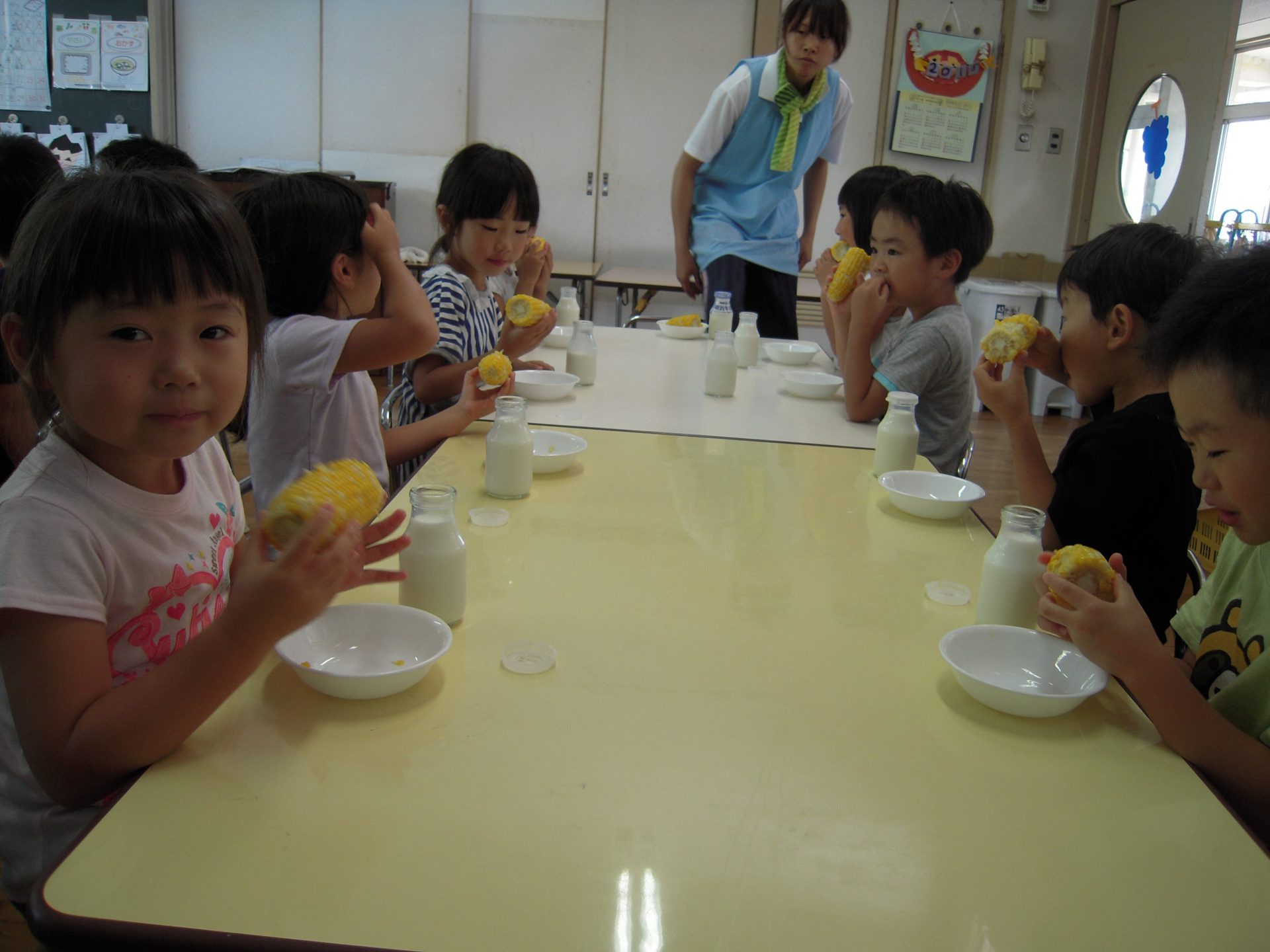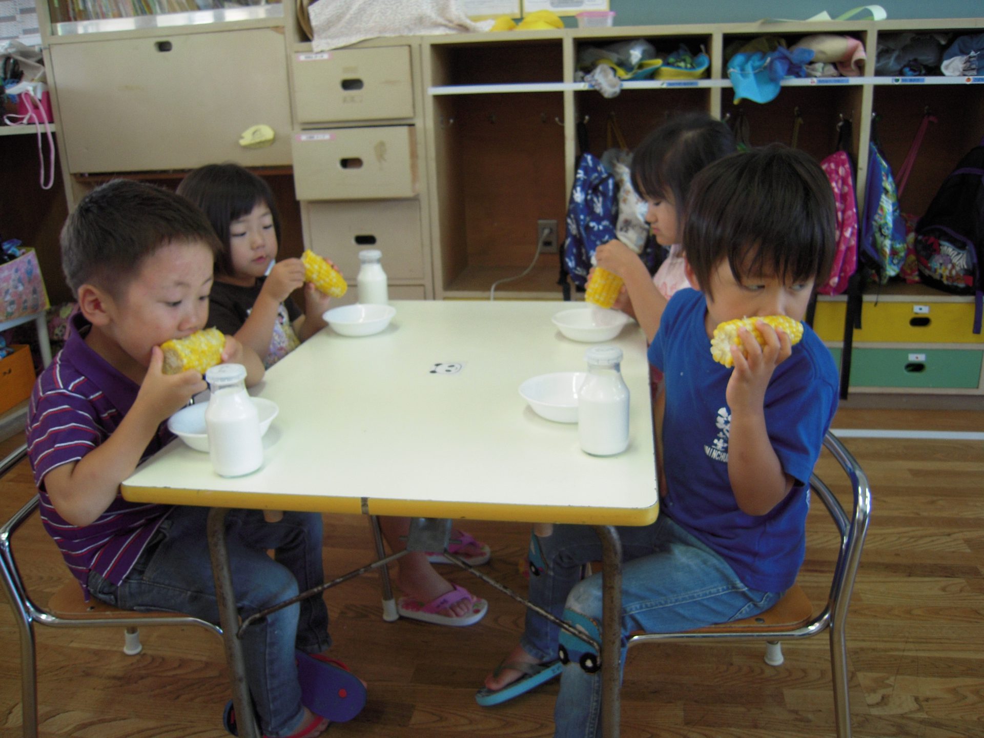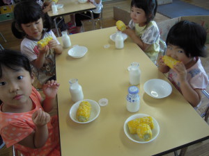 今日は年長さんは少し盛りだくさんでしたが、旬の地元食材に触れ、食の面から自然をたっぷり感じられた1日だったと思います。とうもろこしのおやつはこれから週に1回、提供させていただきます。次回はまた違う種類を予定しています。次回は何色のとうもろこしになるでしょうか。お楽しみに!