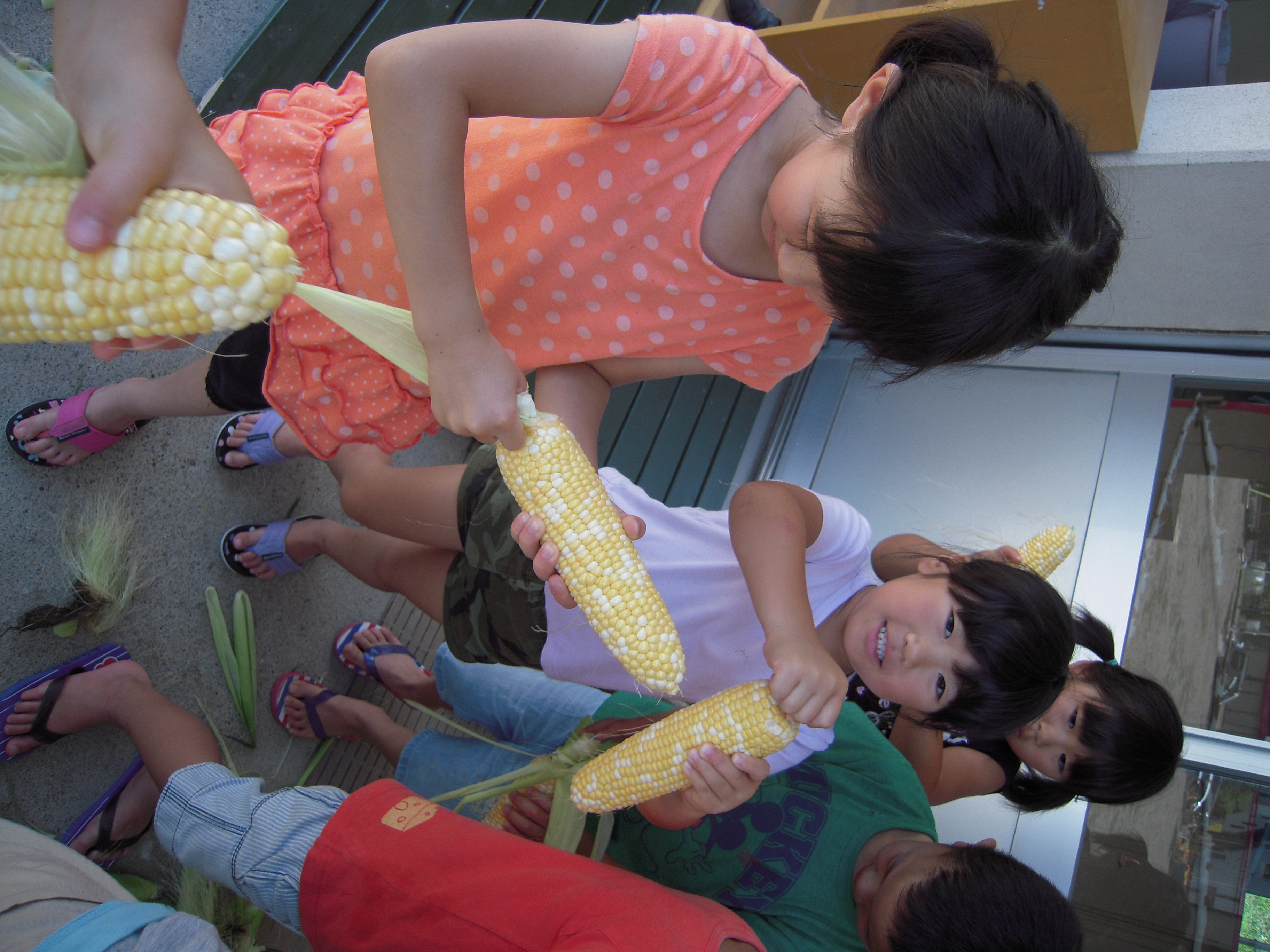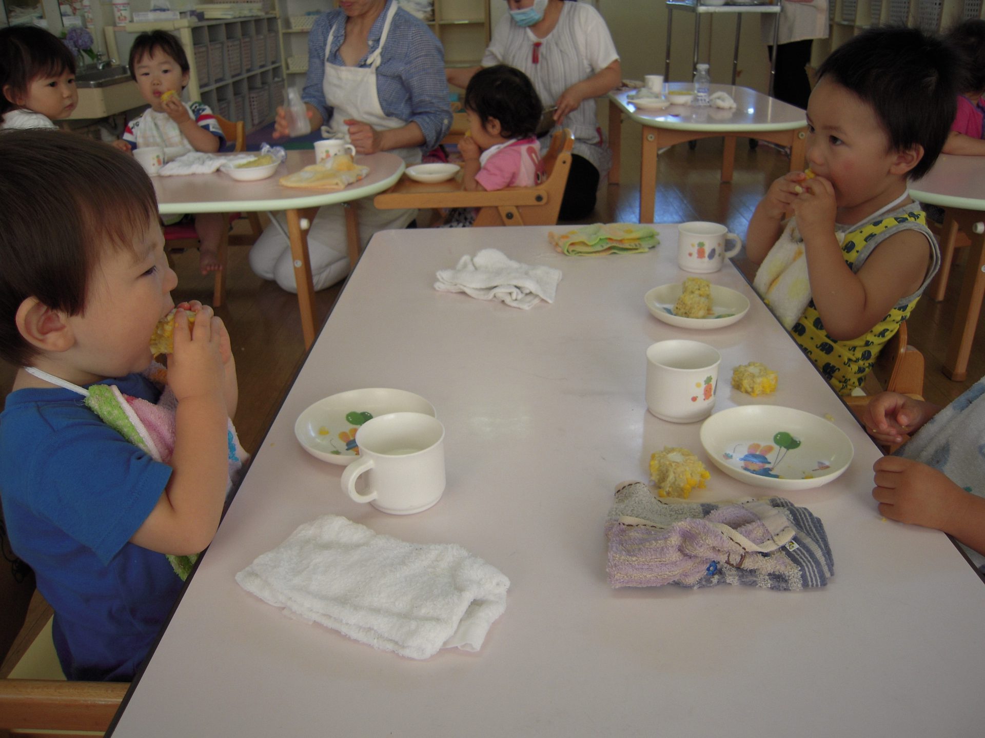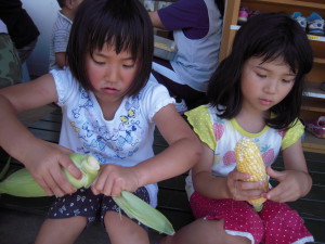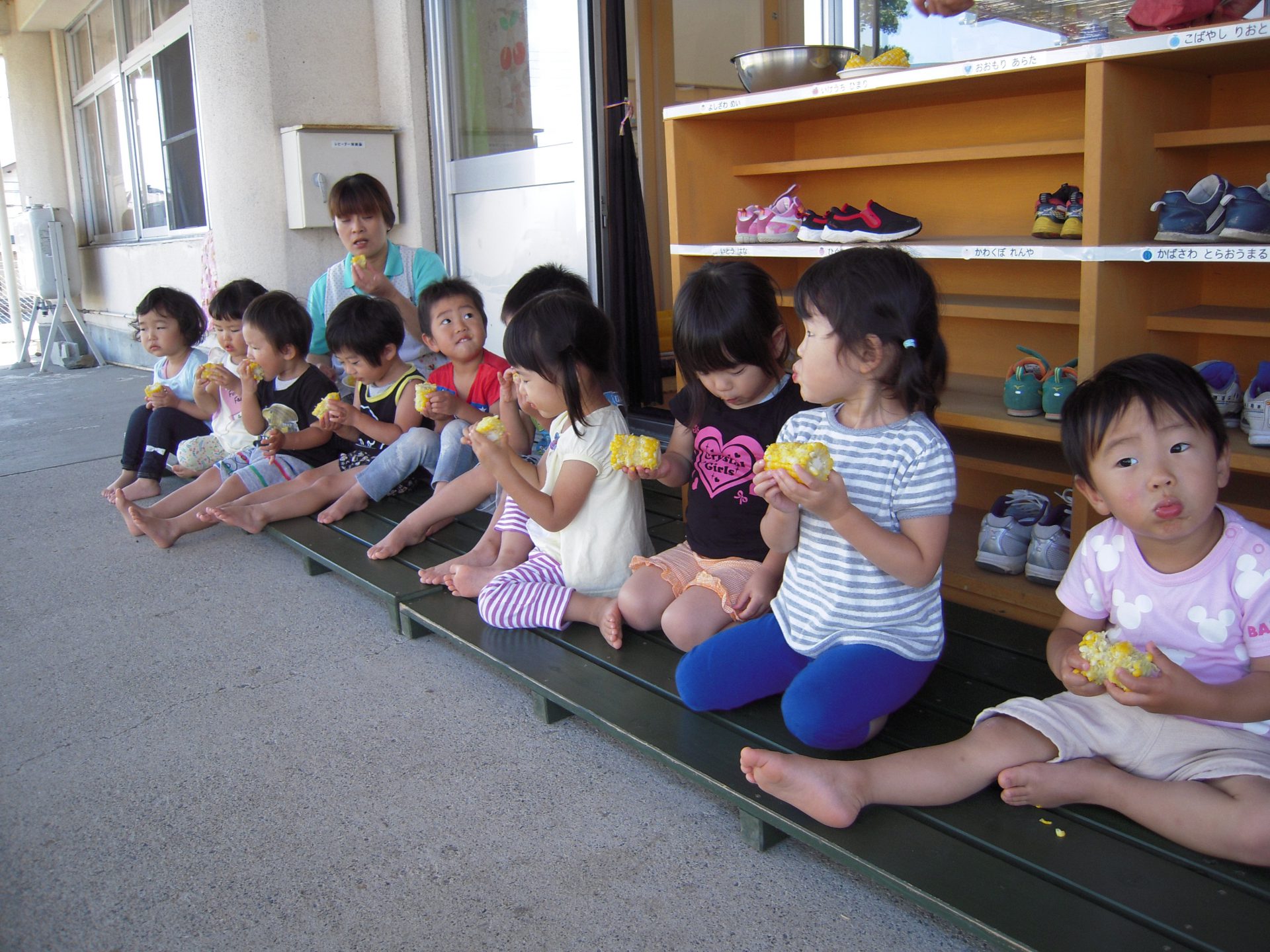 今日は年長さんは少し盛りだくさんでしたが、旬の地元食材に触れ、食の面から自然をたっぷり感じられた1日だったと思います。とうもろこしのおやつはこれから週に1回、提供させていただきます。次回はまた違う種類を予定しています。次回は何色のとうもろこしになるでしょうか。お楽しみに!