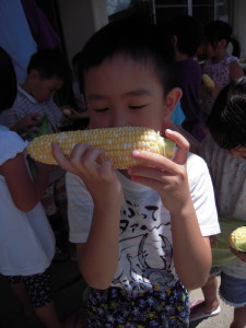 今日の年長児さんは今が旬の地元の特産品「ブルーベリー」と「とうもろこし」を満喫しました。