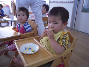 1歳児さんも、前歯でとっても上手に食べていました。きれいに食べた軸の部分を、まだ食べたそうにしゃぶっていて、おかわりをして3切れ目の子も!食べ慣れていますね。