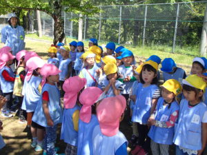年長は帽子の色が同じ。年中は黄色とピンクで違うけど