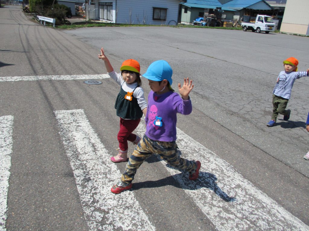 手をあげて、車の人に合図して渡るんだよ、とお手本になってくれます。