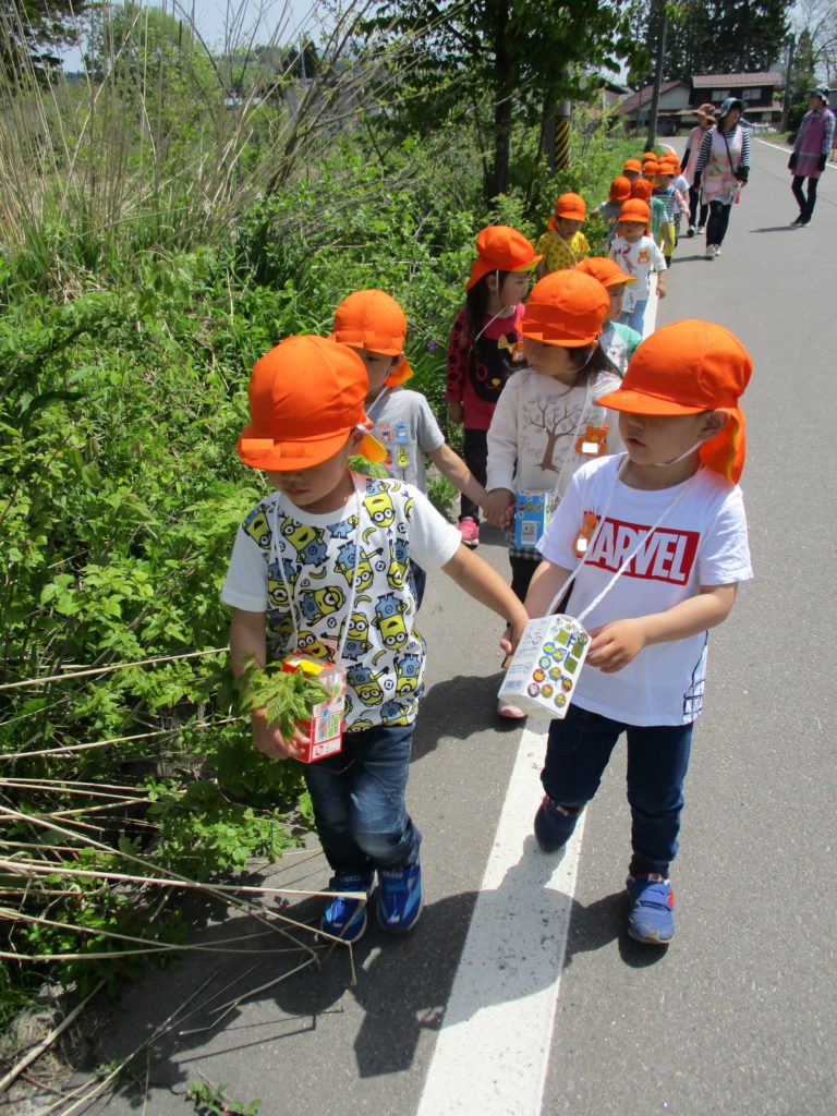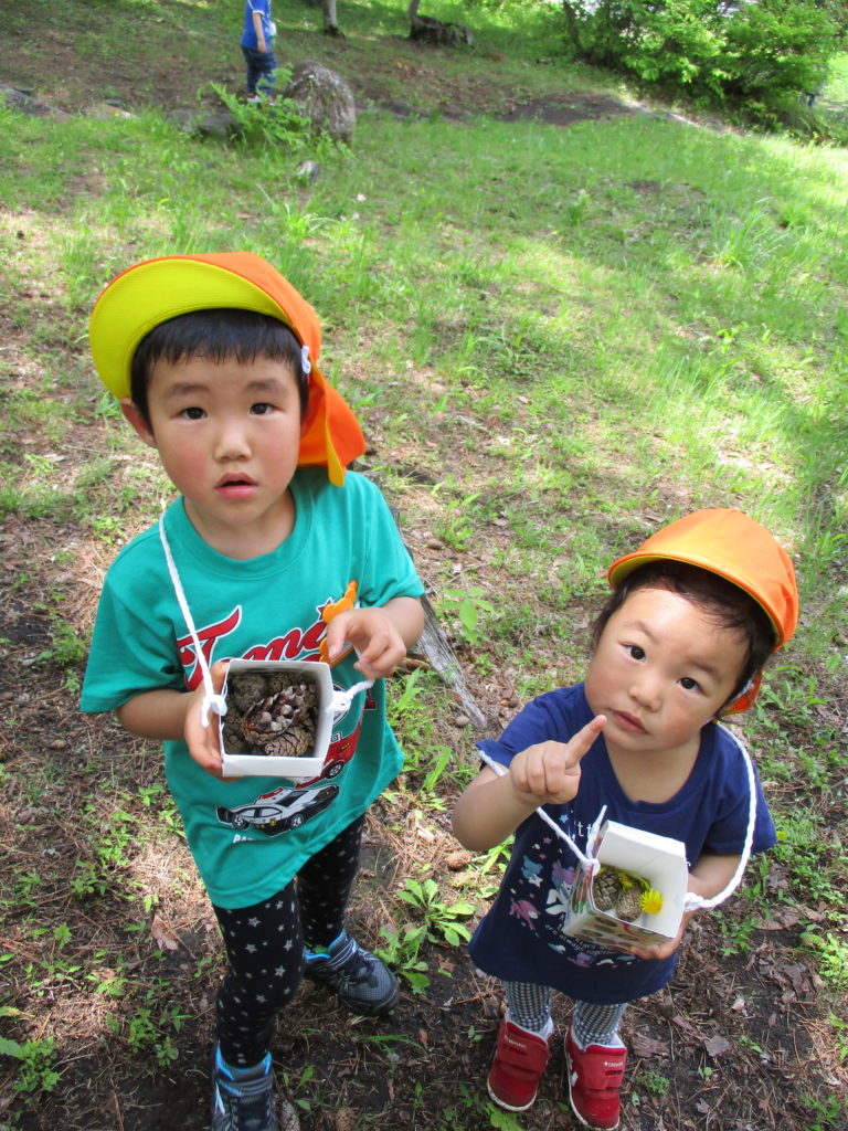 自分たちで作ったお散歩バックにたくさんのお土産を持って満足そうに保育園に帰って来ました。