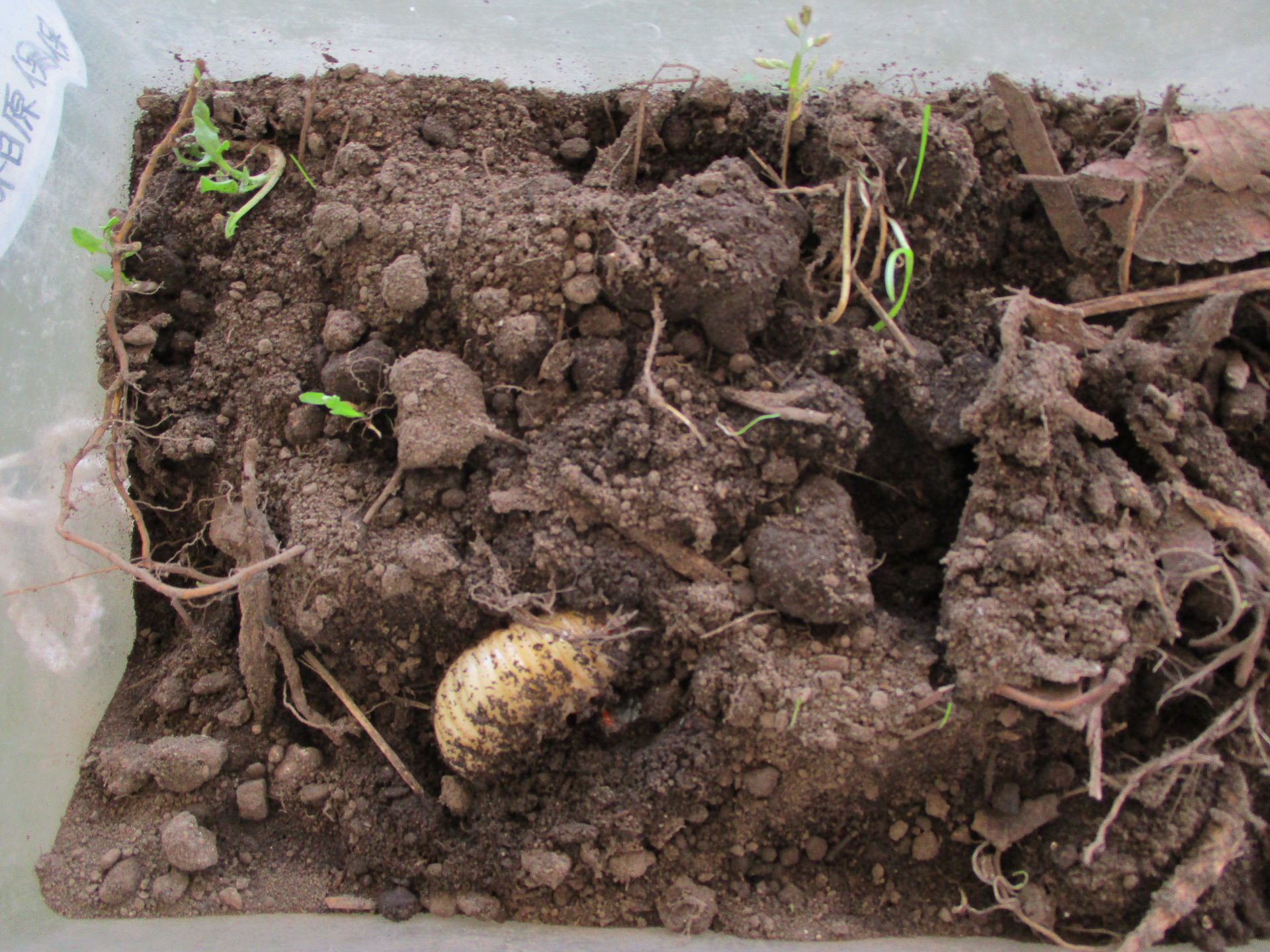 そして、そーっとカブトムシの幼虫の入った虫カゴを廊下に置いておくと・・・ほとんどの時間は土に潜っている幼虫。「なにがいるの?」「何もいないね」と土だけが見える虫カゴを興味深そうにのぞいていました。