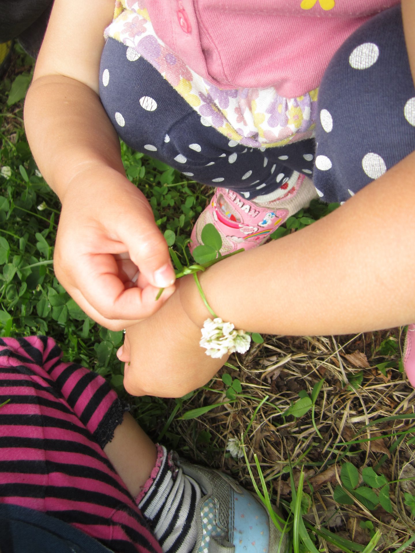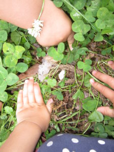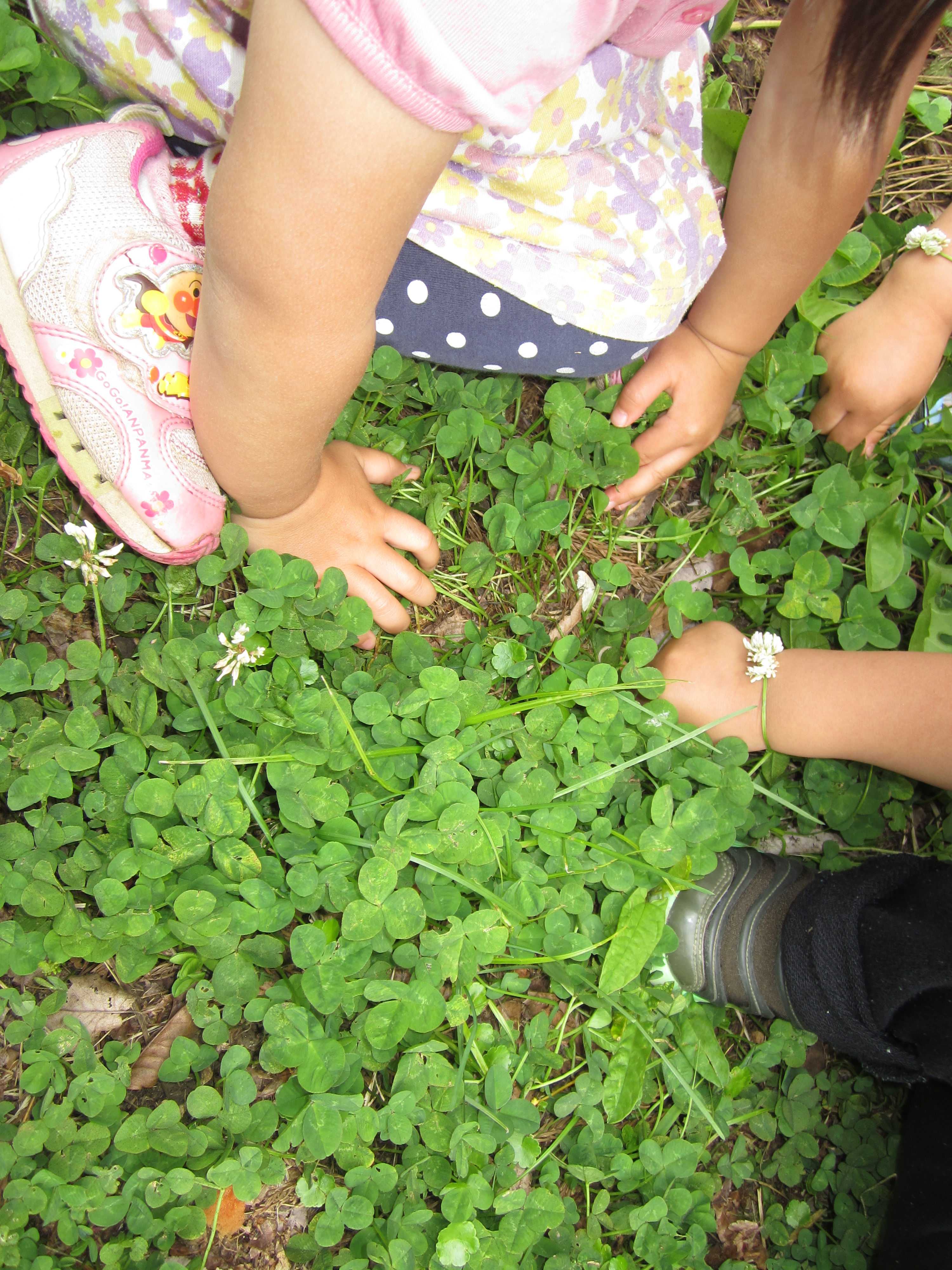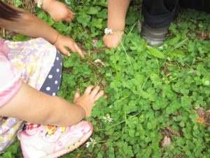 シロツメクサに集まる子どもたちに「来てー」と呼ばれ行ってみると