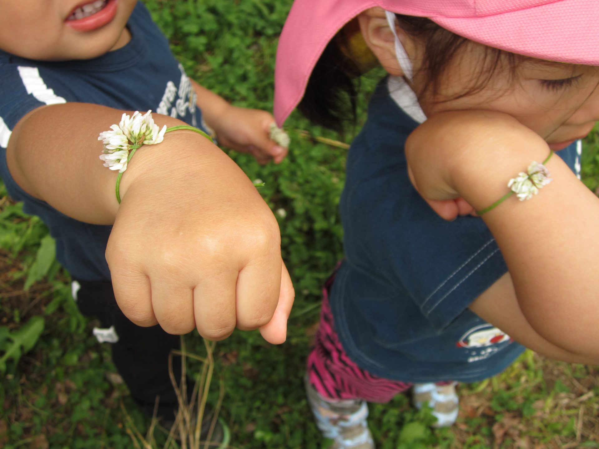みんなでシロツメクサのブレスレットづくりの始まりです。