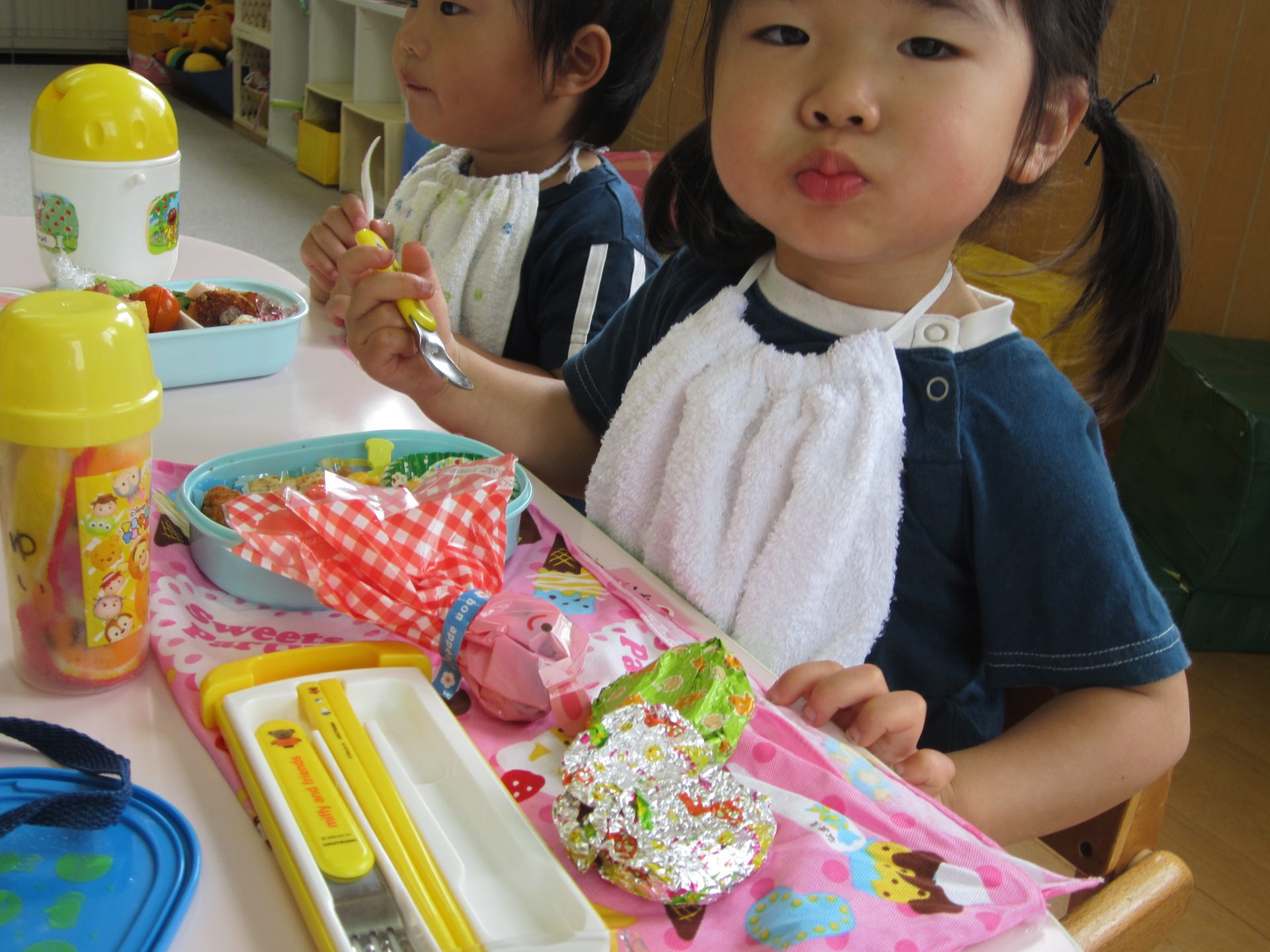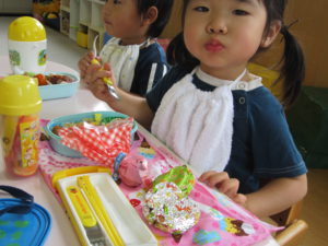 お散歩から保育園に帰ってきたら、待ちに待ったお弁当の時間です。