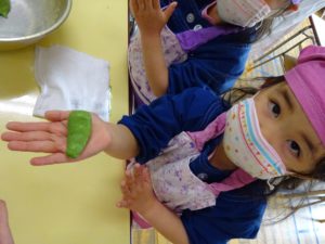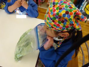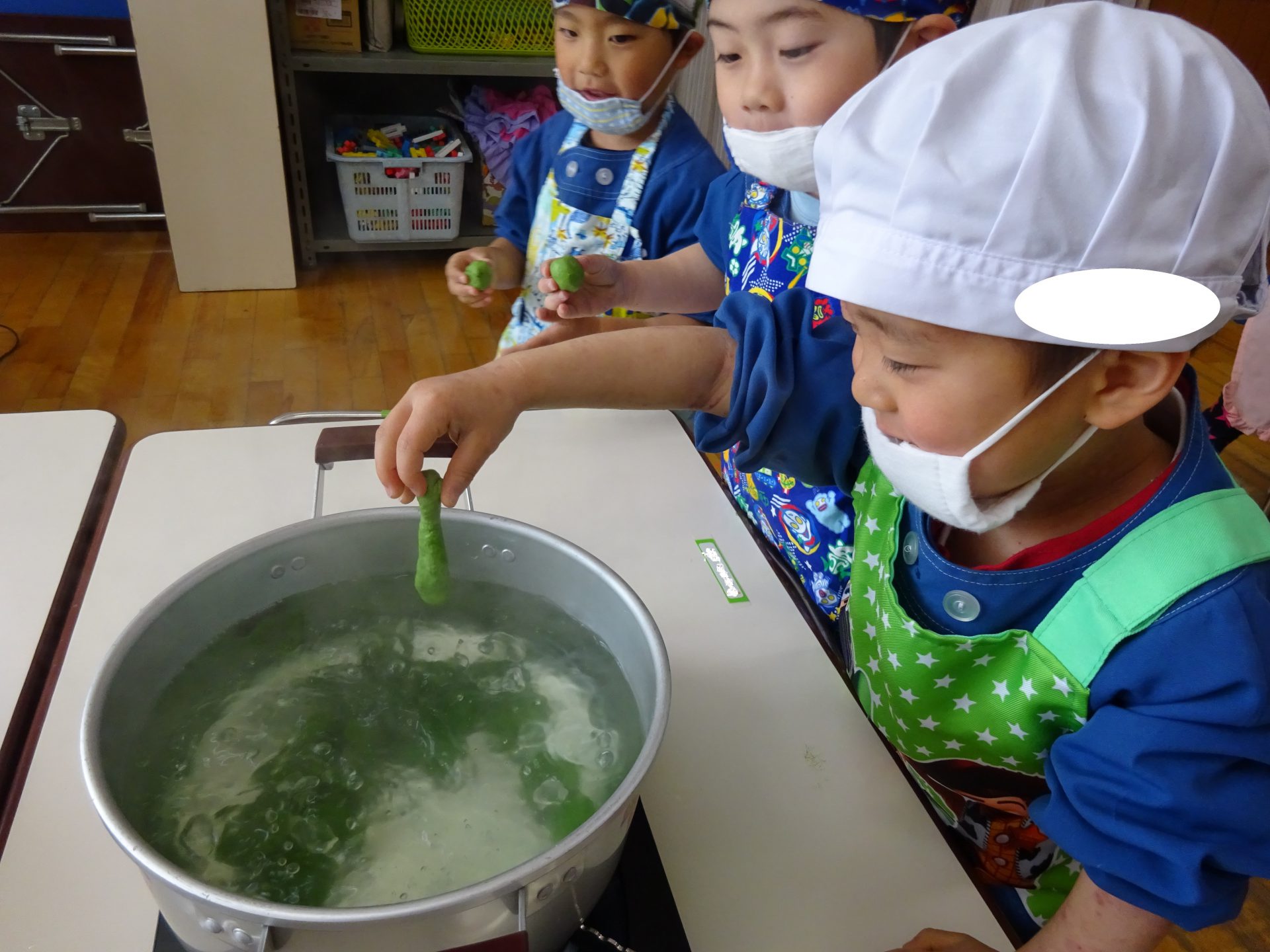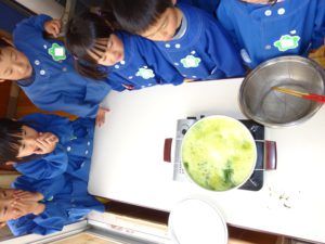 よもぎ摘みをしたあとで、クラスでよもぎをゆでる