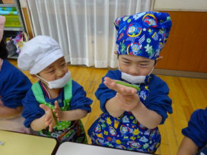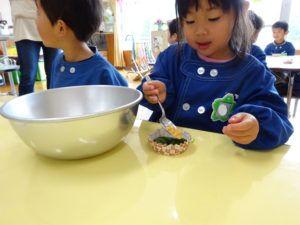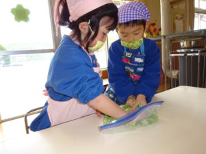 「よもぎ」を知らない子どもたちもいたので、実際に自分たちで摘んでくるところから始めた。食材の香りや色・形の変化にも気づき、場面場面で子どもたちの驚く表情を見ることができた。