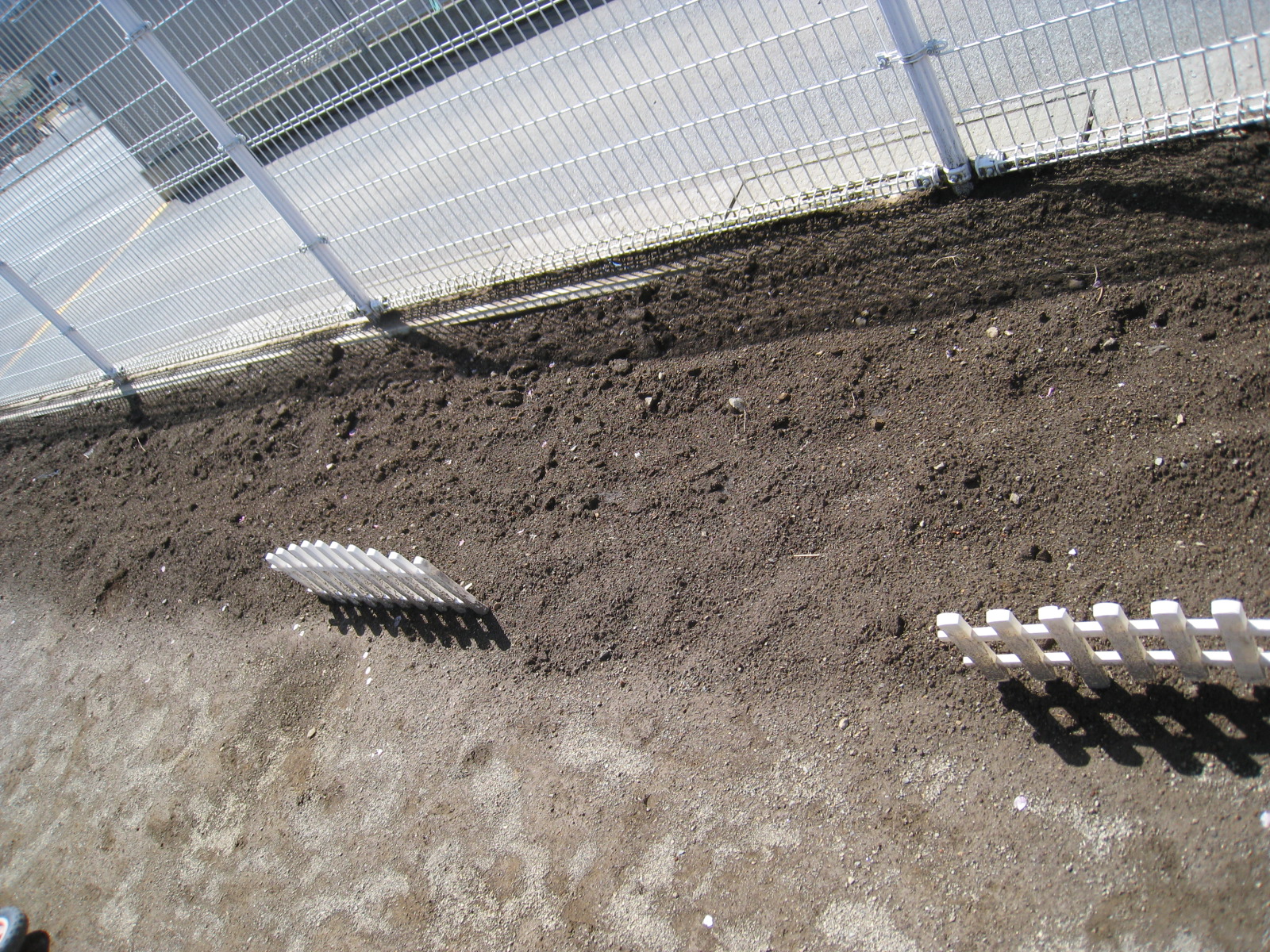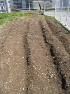 園庭の一部や園舎裏の一部分を利用して耕し、畑作りの準備をしました。苗を植える場所には土を盛り上げて畝を作ったりマルチを張りました。