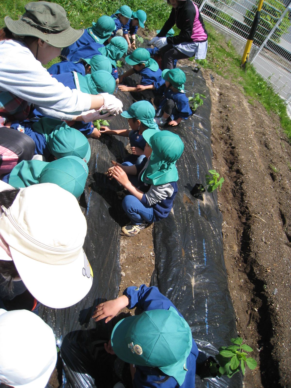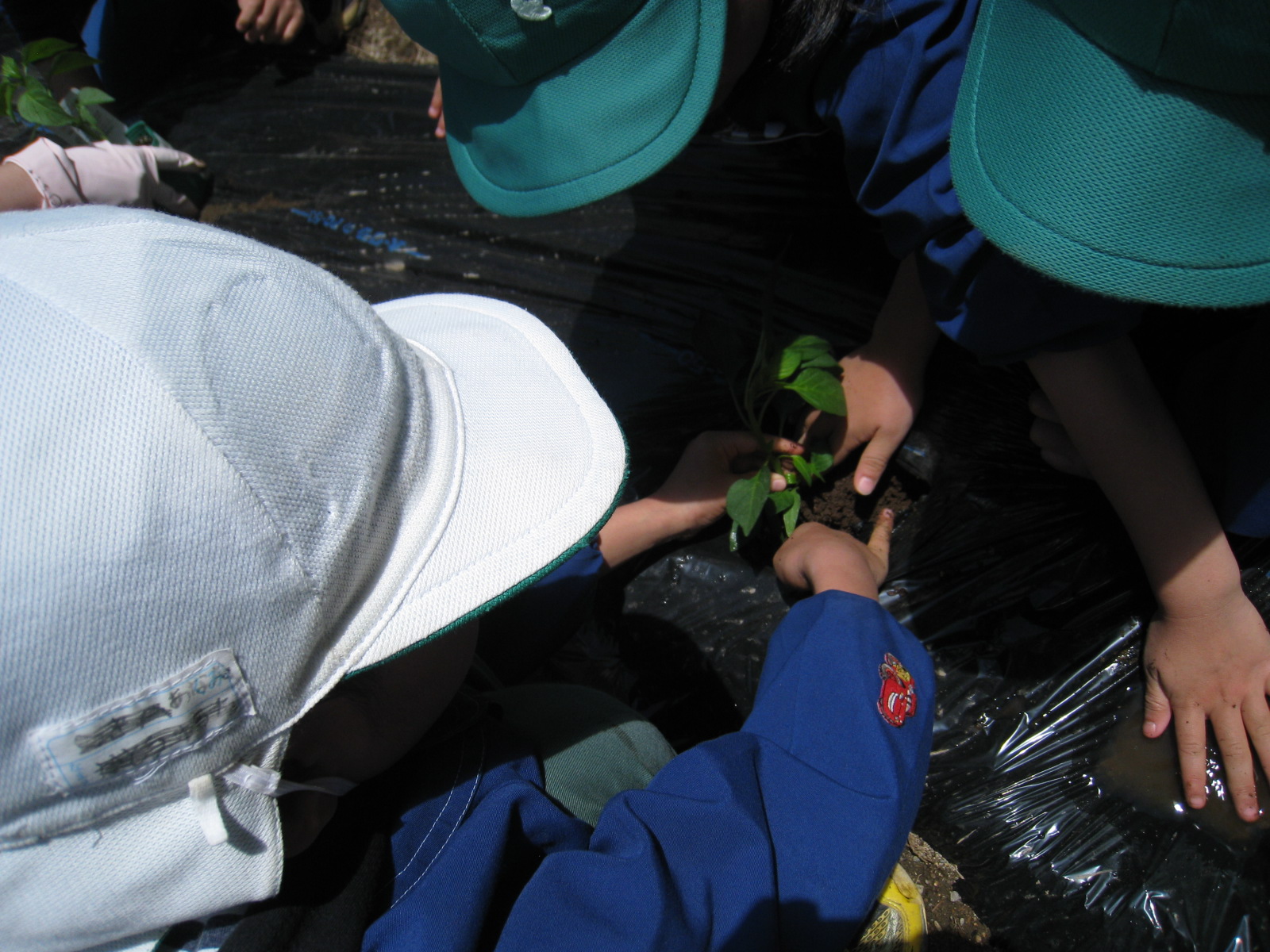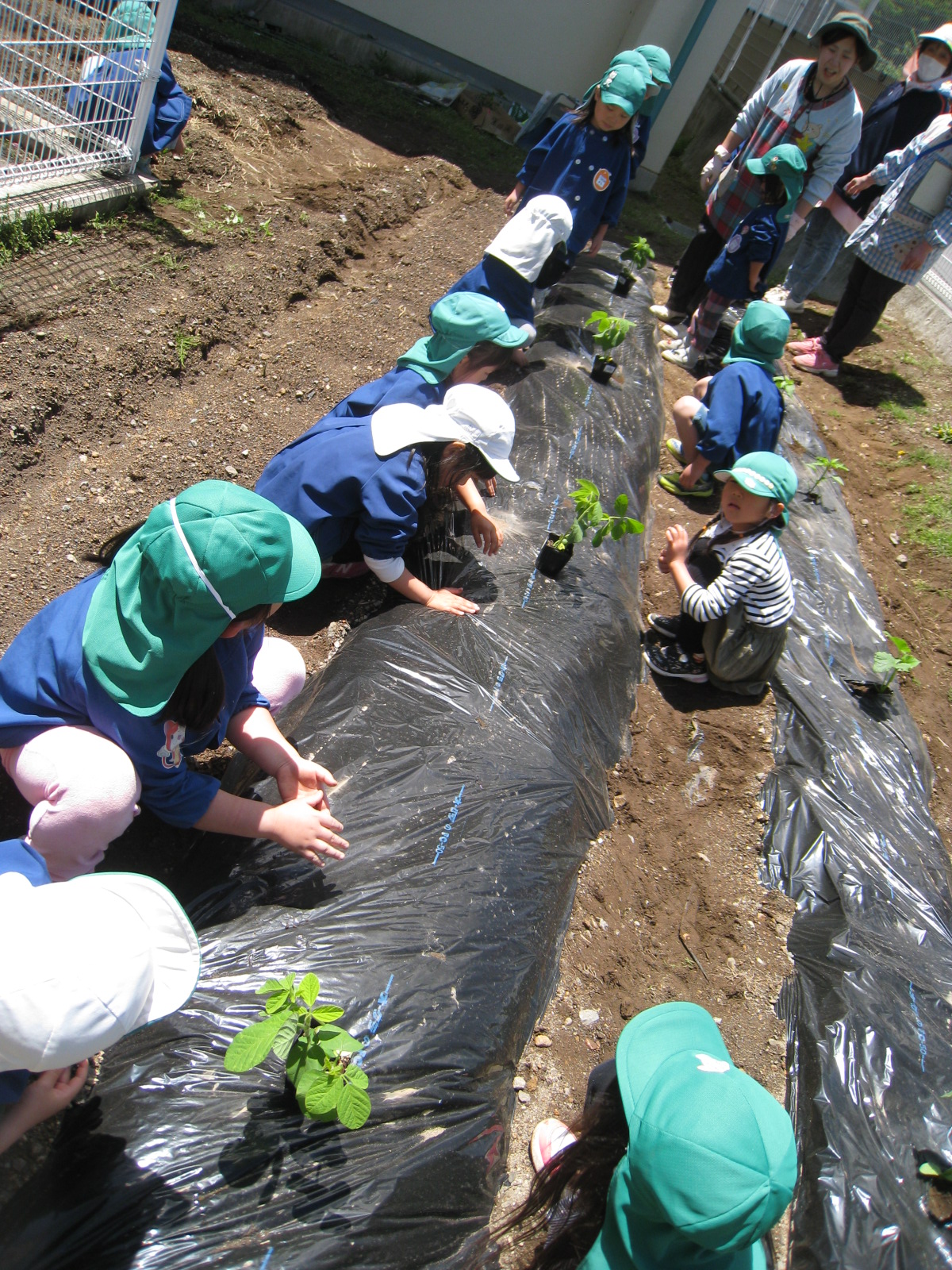 マルチに穴を開けました。マルチのビニールに苦戦している子ども達は・・・「かたくてきれない (あなが)あかないよー!」「ぼくにもやらせて!!」などなどの会話をしながら指や爪を立てて自分たちで工夫しながら穴を開けることができました。