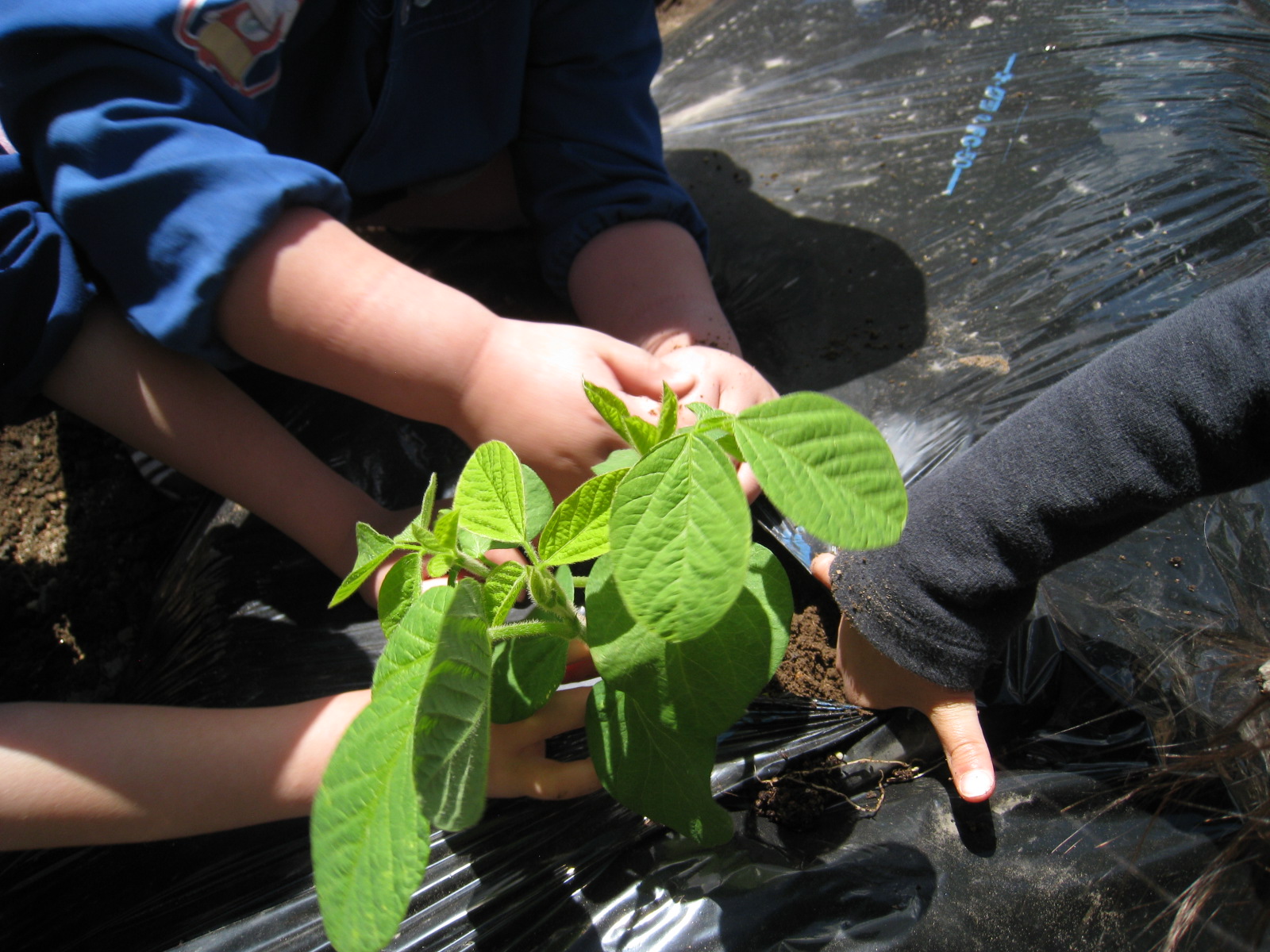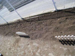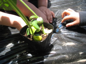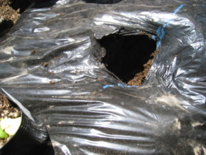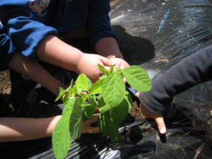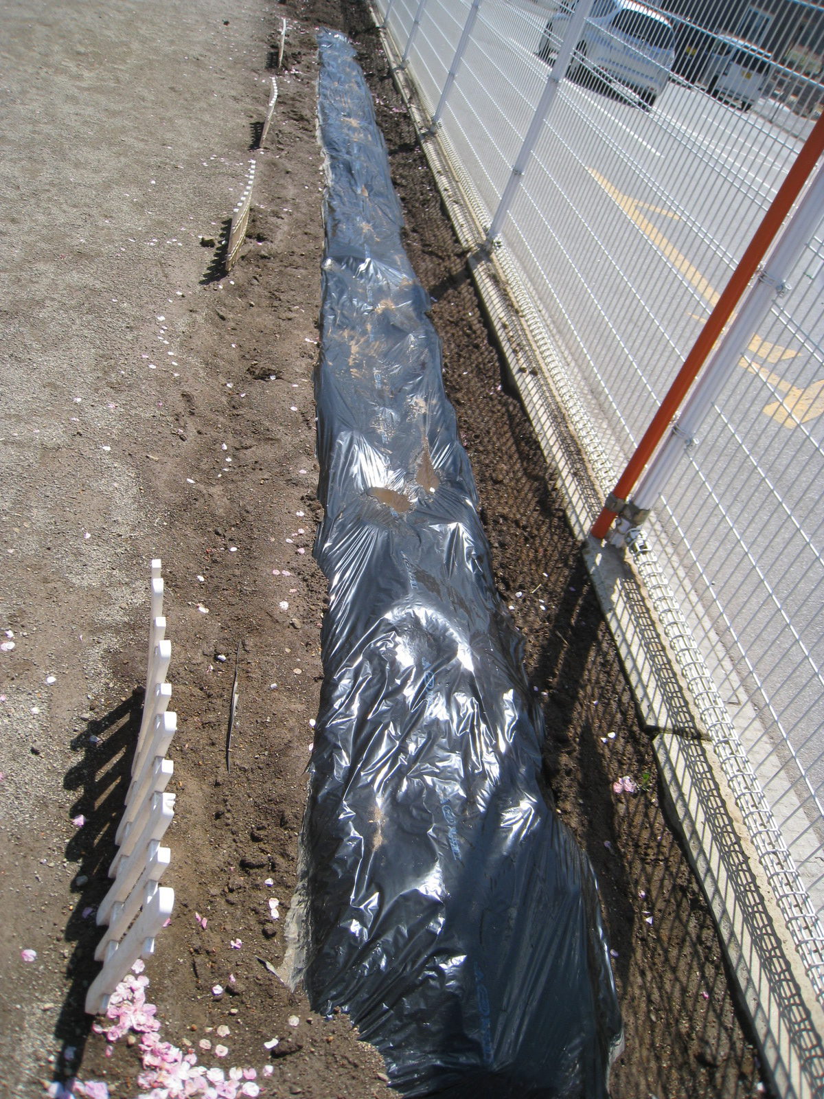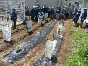 マルチに穴を開けました。マルチのビニールに苦戦している子ども達は・・・「かたくてきれない (あなが)あかないよー!」「ぼくにもやらせて!!」などなどの会話をしながら指や爪を立てて自分たちで工夫しながら穴を開けることができました。
