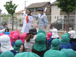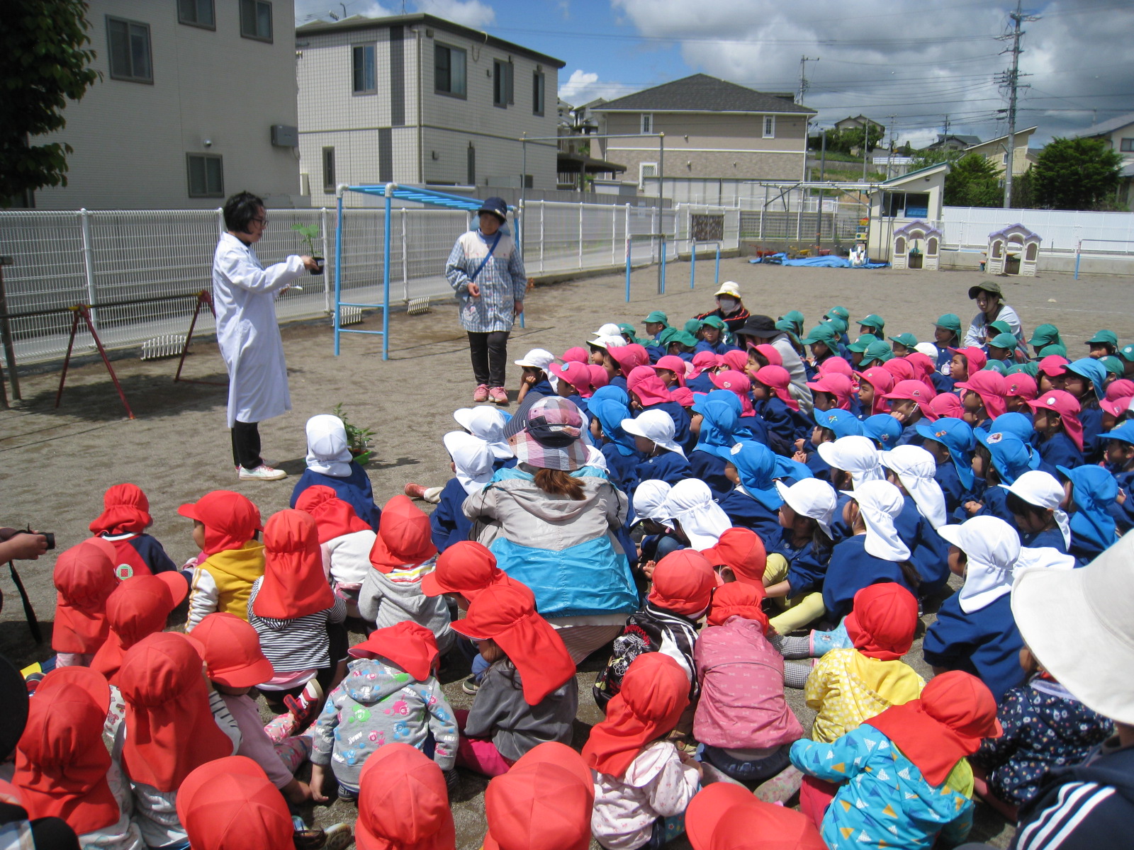 一斉集会で作物についてお話を聞きました。”苗博士”も登場しクイズで楽しみながら各年齢が育てる苗について考えました。