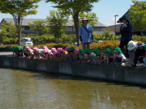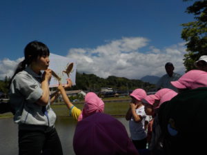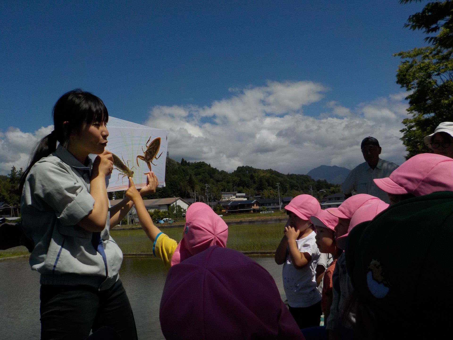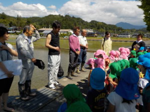 今日は藤竿さん、田んぼの生き物の話もしてくれました。タガメの写真を指差して「これなーんだ?」「カブトー!」と子どもたち。今はあまりいないのかな?それとも子どもたちが、田んぼや小川で遊ぶ機会が減ったかな?「この田んぼには、豊年エビもいっぱいいるから見つけてみてね。」