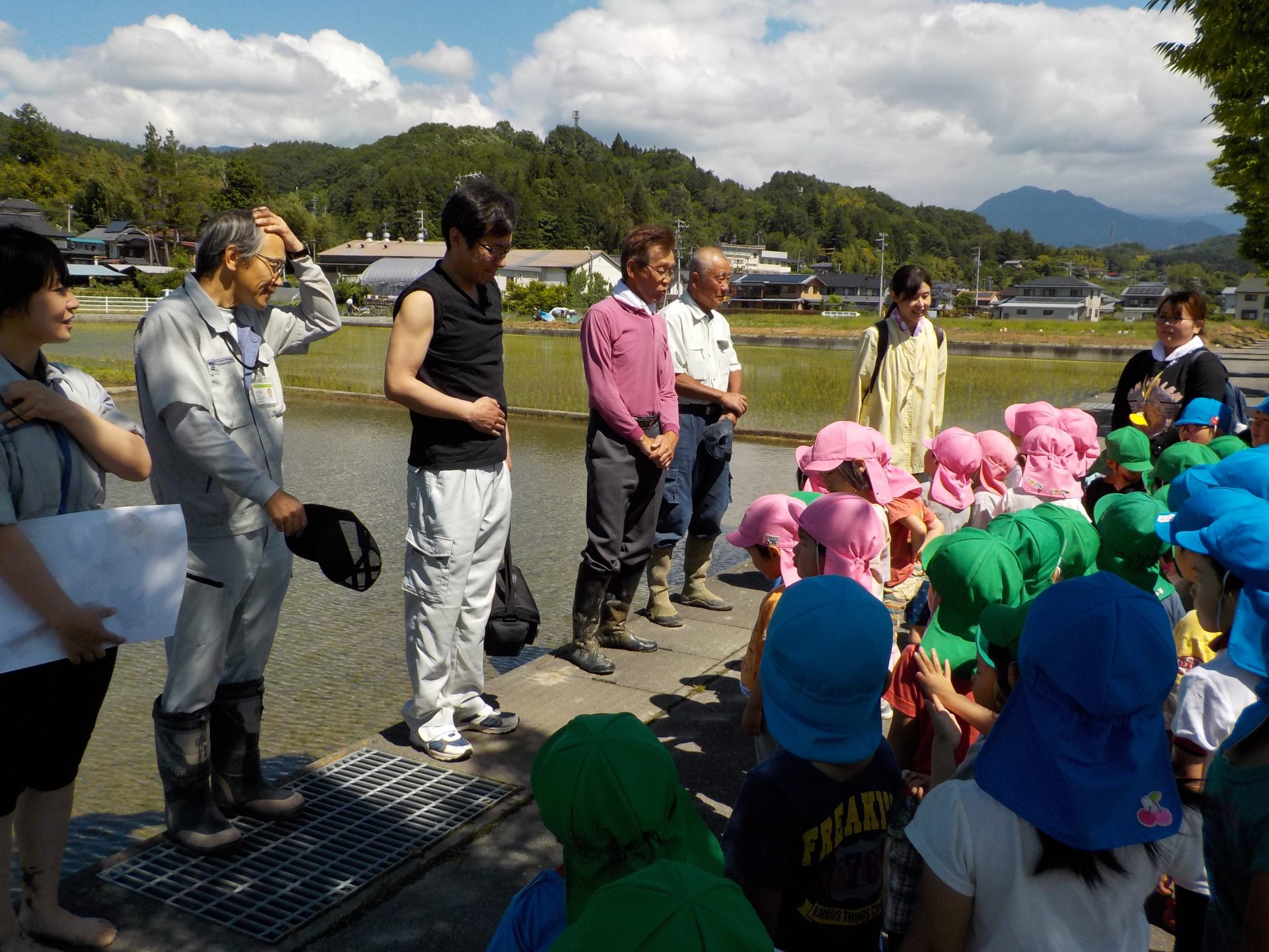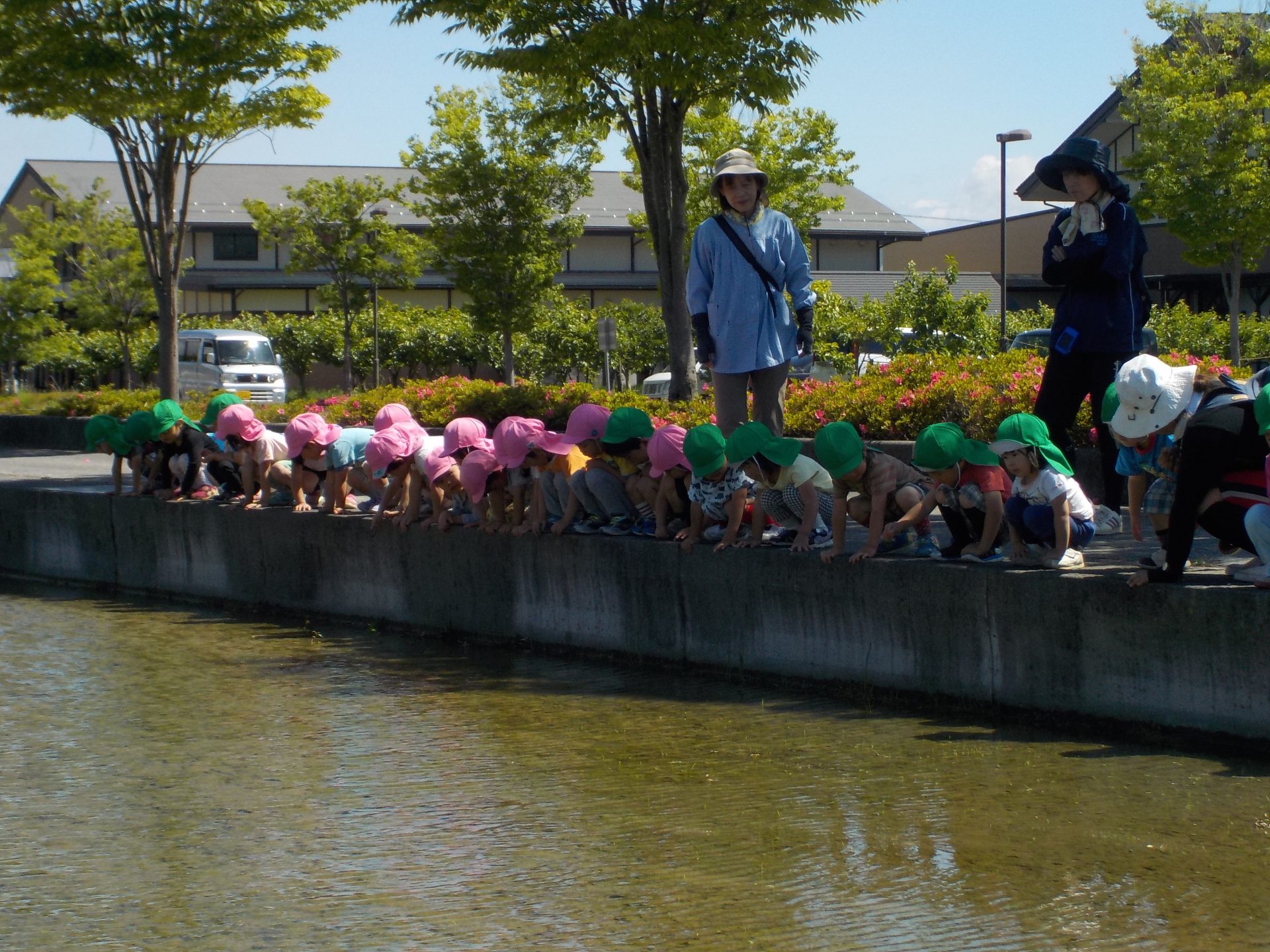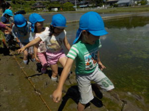 田んぼに入る前にみんなでそーっと覗いてみました。「豊年エビ見えたよー。」「アメンボも。」「「オタマジャクシ。」「ヤゴはトンボの赤ちゃんだよ。」いろんな生き物が見つけられたね。
