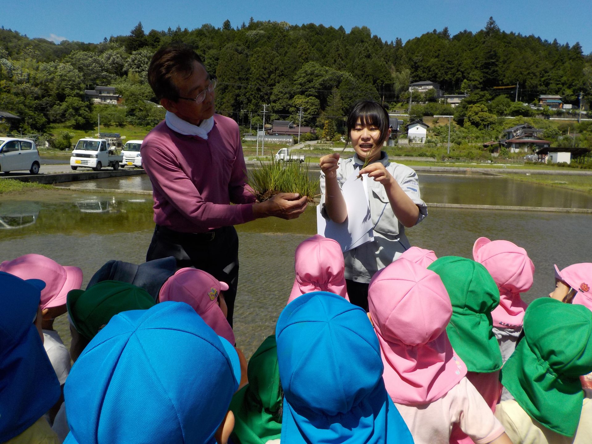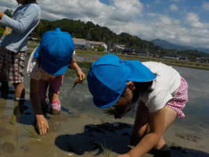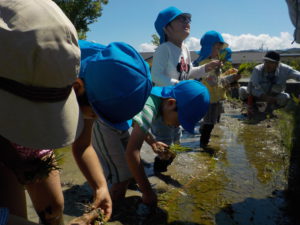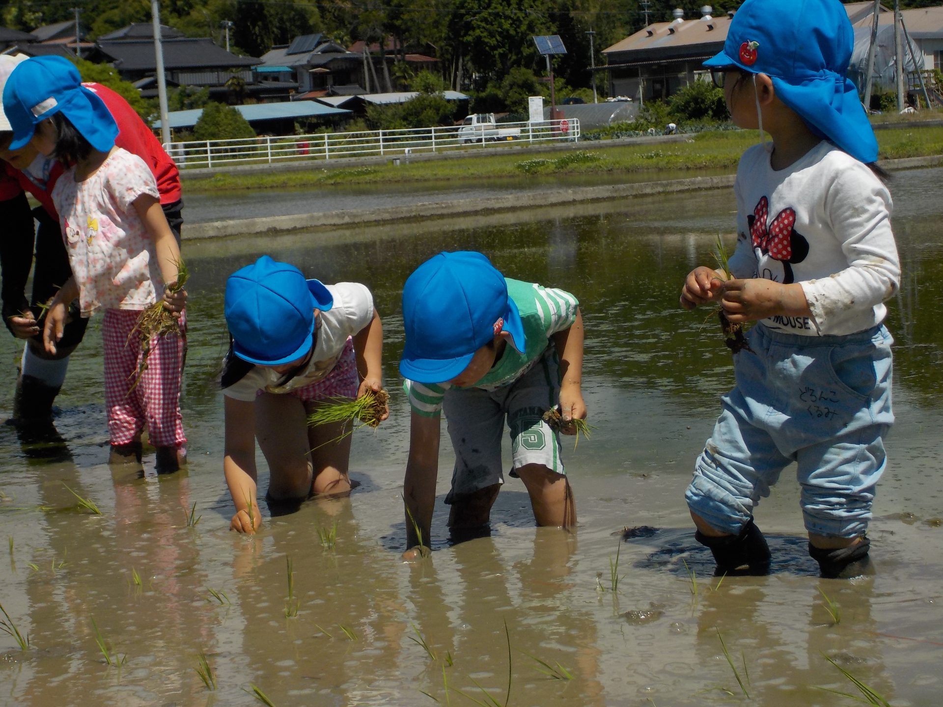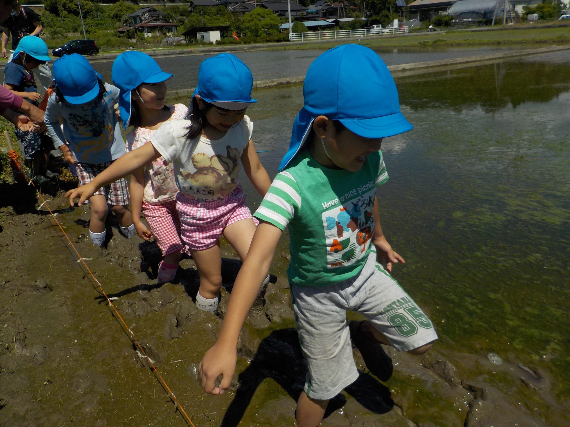 JA川路事業所の田んぼをお借りして、農協の方に教えて頂きながら、年長さんが田植えをしました。