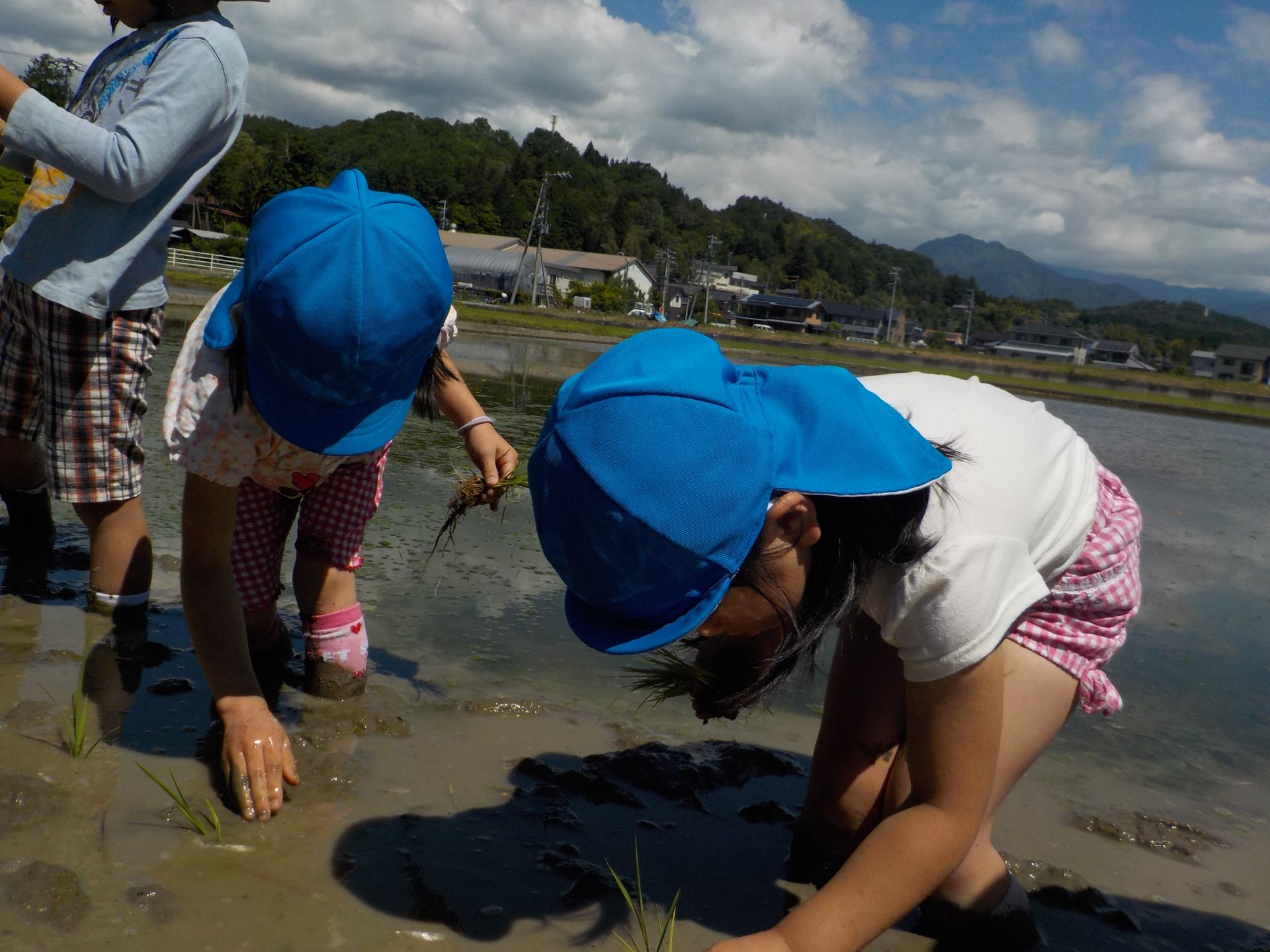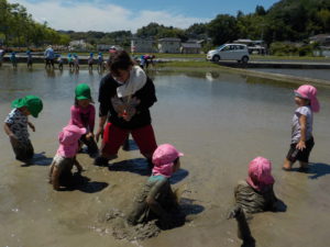 田んぼで田植えをしたり、泥んこで遊ばせてもらうことは、子どもたちにとってとても貴重な体験です。毎日口にするお米はどうやってできるのか、米も野菜も一生懸命っ作ってくれる人がいて食べることができ、食は私たちの命の源だということ。年長児には労働の大変さも少しずつ知っていってほしいと願います。