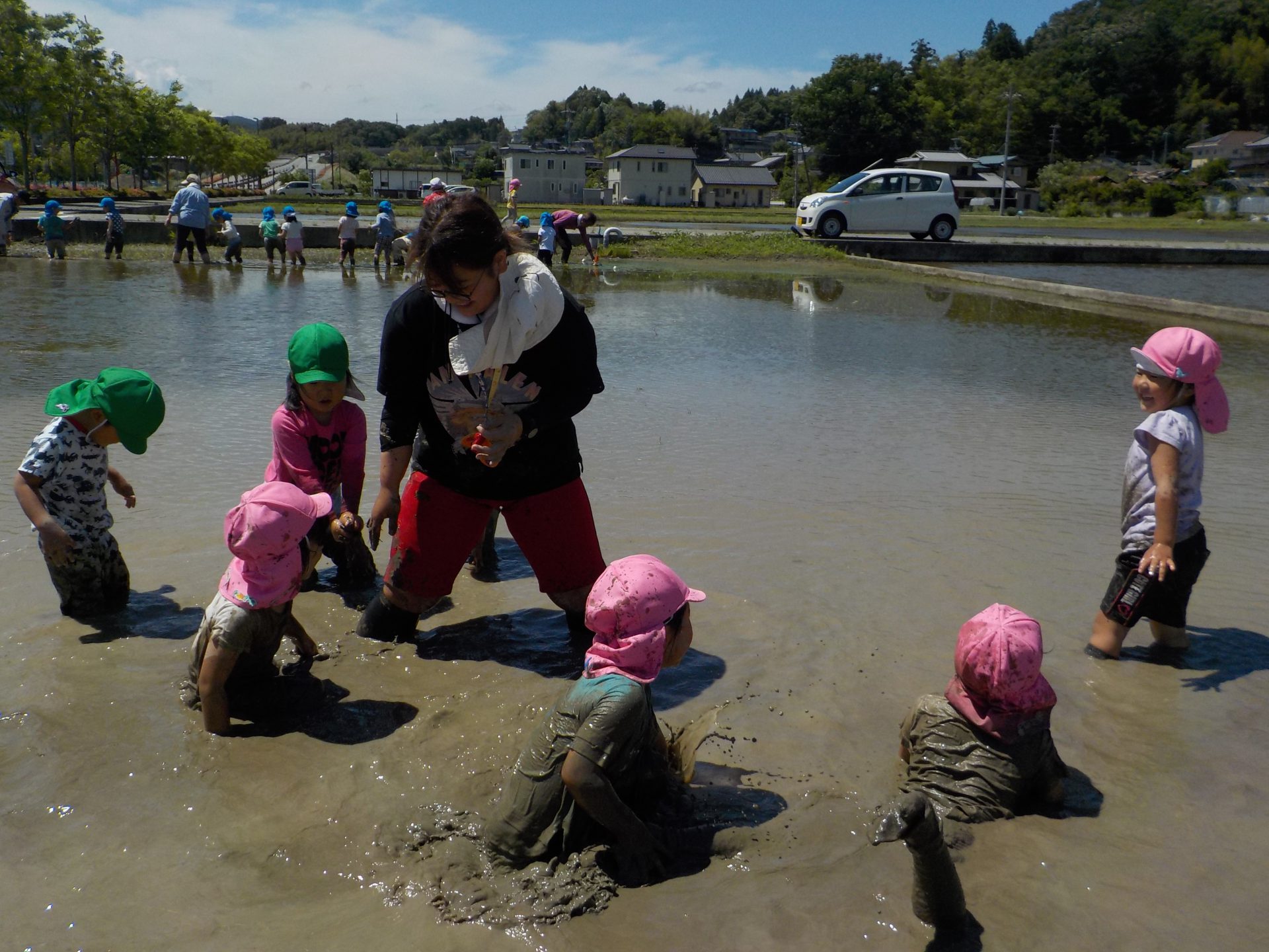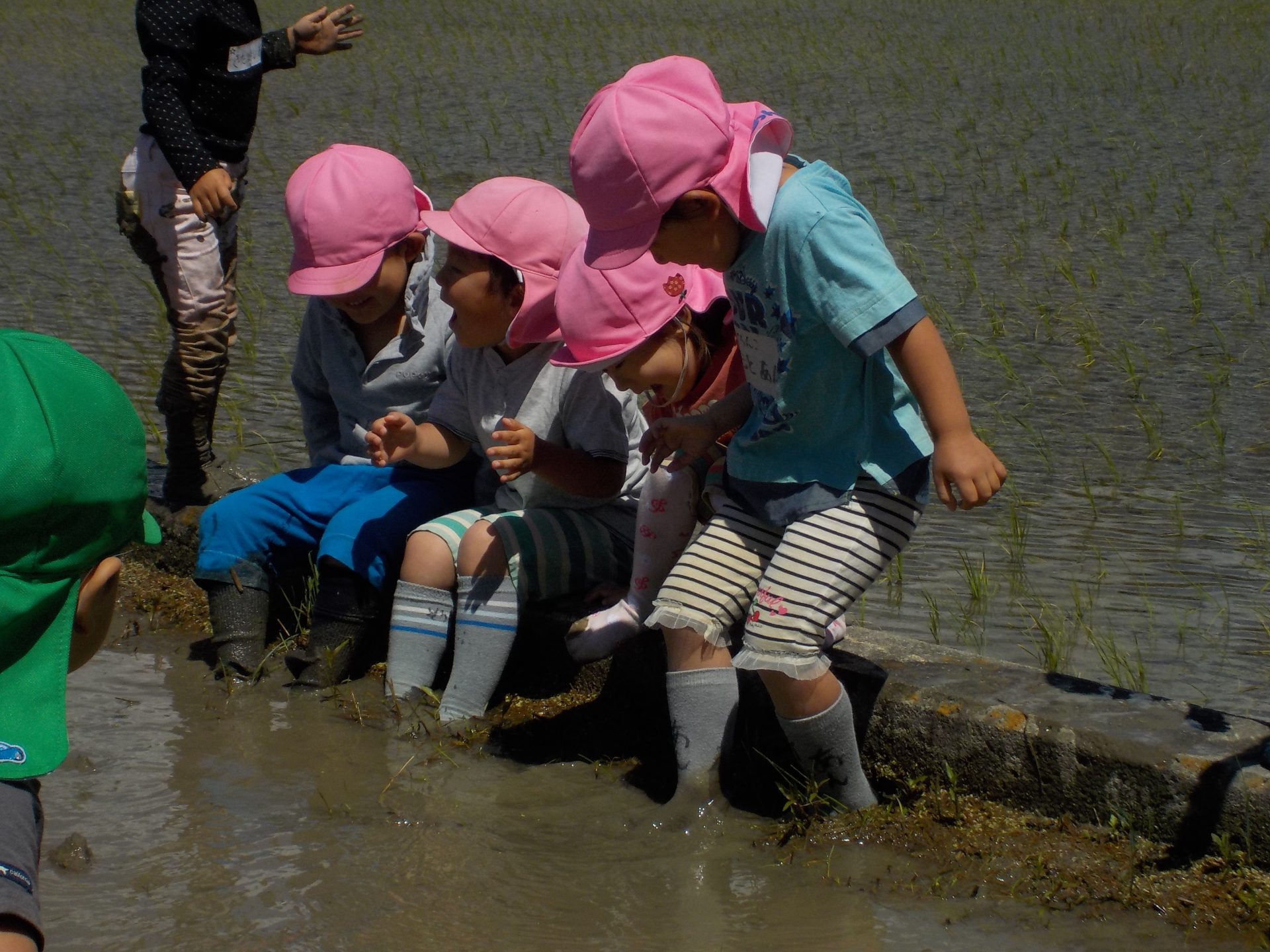 田植えをしながら、応援してくれている小さいお友だちに「この中、あったかいんな。」「そう、そう、温泉みたいだよ。」「足湯だよ。」と教えてくれる年長さんです。今日はいい天気で、お日様がしっかり田んぼの水を、地面を温めてくれていることを肌で感じることが出来ました。