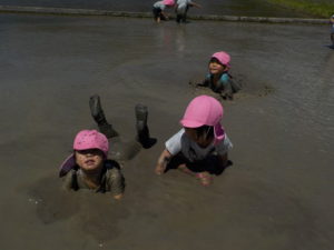 そして、みんなで泥んこ遊びです。田んぼに入るのが初めての年少さんもいます。それぞれのペースに合わせて、少しずつ田んぼに入り慣れていきました。