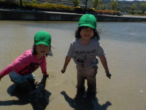 どろんこが苦手で慎重な子は、先生の手につかまりながら「動いてる。動いてる。」とつぶやいて、じーっと水面を見つめ、風にさざめく水の動きや、泥にだんだん足がうずまっていく感覚を感じているようでした。
