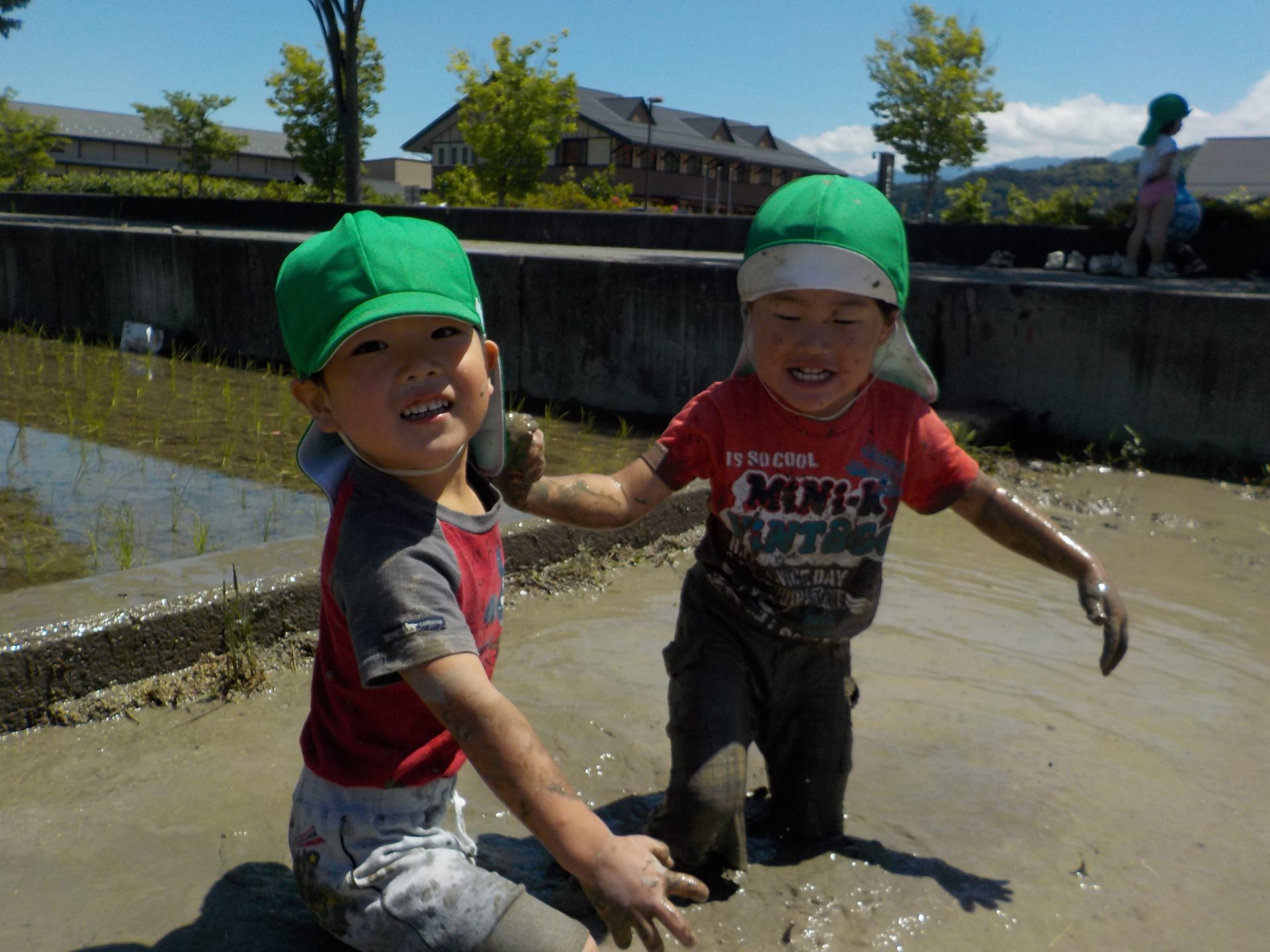 田植えが出来るのも年長さんの特権!「まかせといて。」と、はりきってくれました。